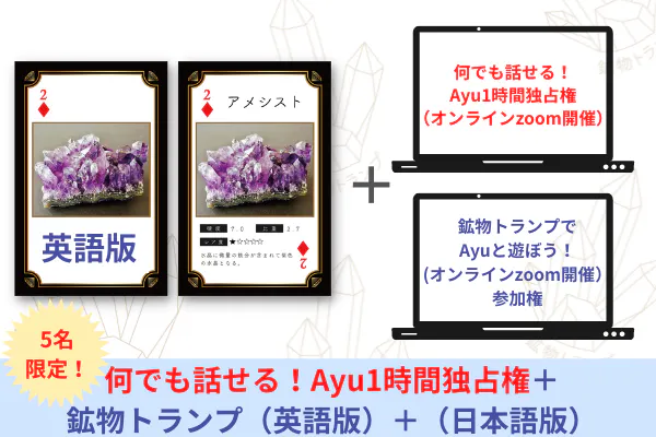 リターン⑦:新装版「鉱物トランプ」日本語版1つ+英語版1つと、「なんでも話せる!Ayu1時間独占権」と、「鉱物トランプでAyuと遊ぼう!」オンラインzoom開催参加権です。