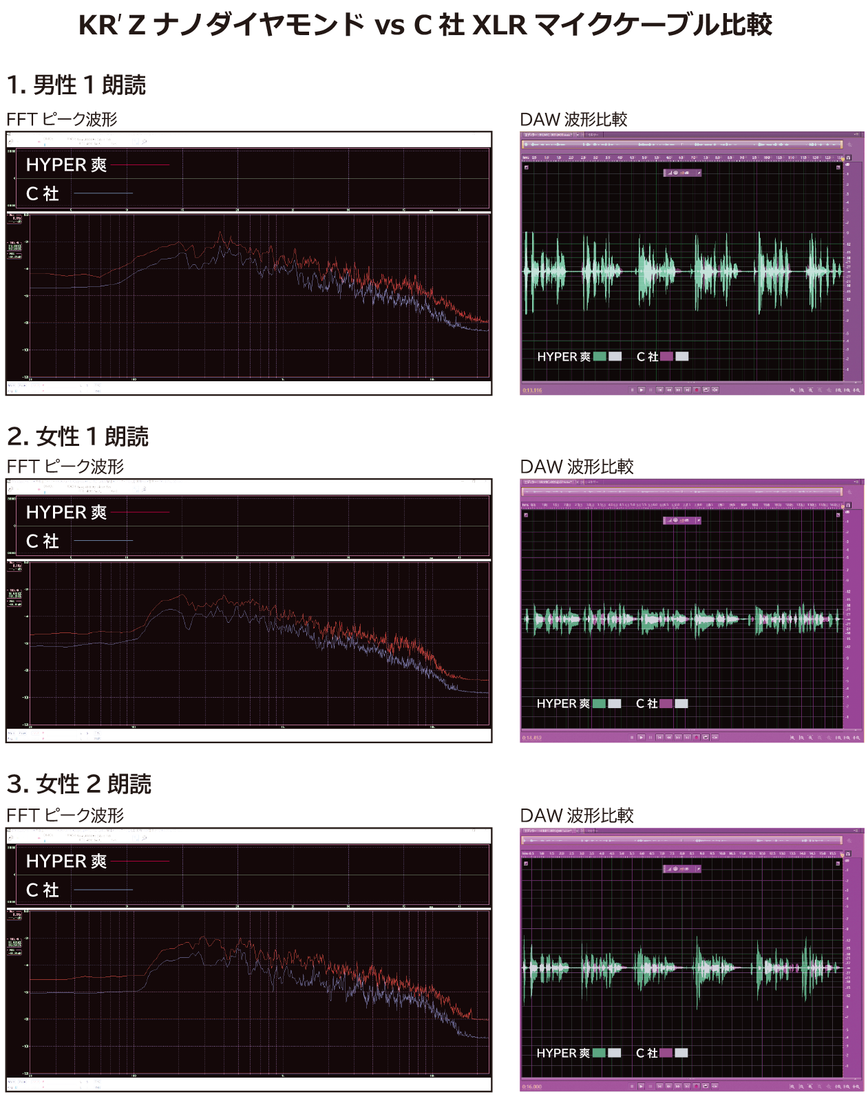 私は、芯線にナノダイヤモンドをコーティングできると確信した後、第三者に音質を評価していただきたいと思い、音響機器メーカーに持ち込み、ナノダイヤモンドをコーティングしているケーブルと、していないケーブルの音質試験を行って頂きました。スピーカーケーブル部門ではクロスライン(XL)芯線が最高音質(7つの評価基準全てが5…良好)を獲得し、電源ケーブルとRCAケーブルの組み合わせでは、スパイラルライン芯線が最高音質を獲得しました。この試験でどの芯線でもナノダイヤモンドをコートすると各評価基準において、ほぼ5(良好)に近づき、バランスよく良音に変化することが実証されました。