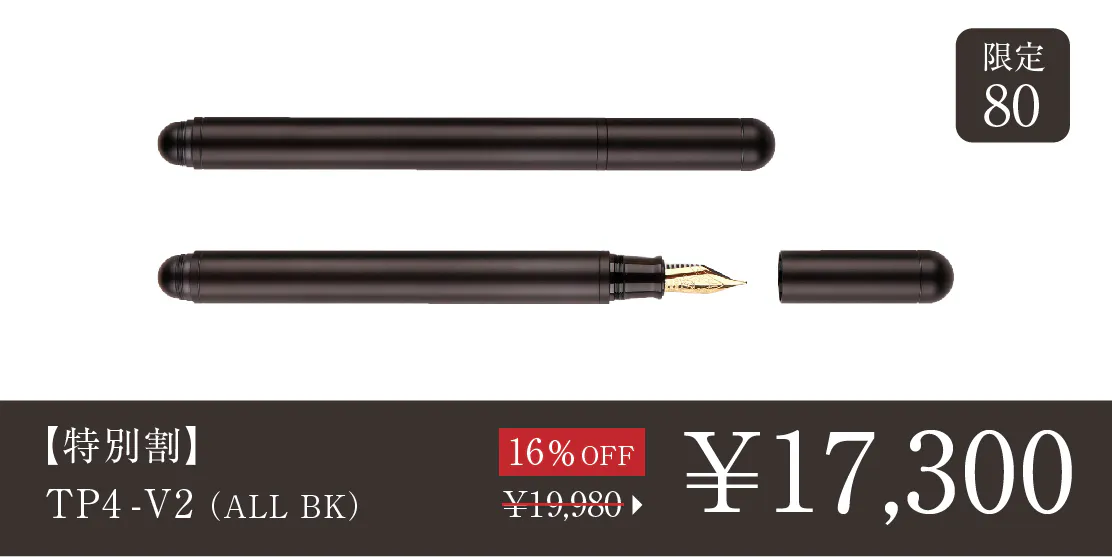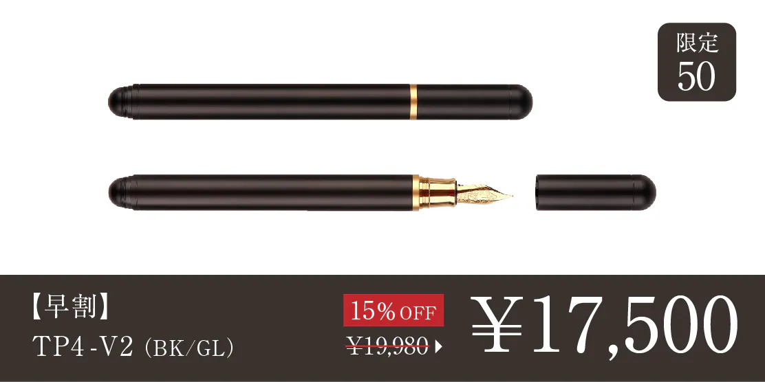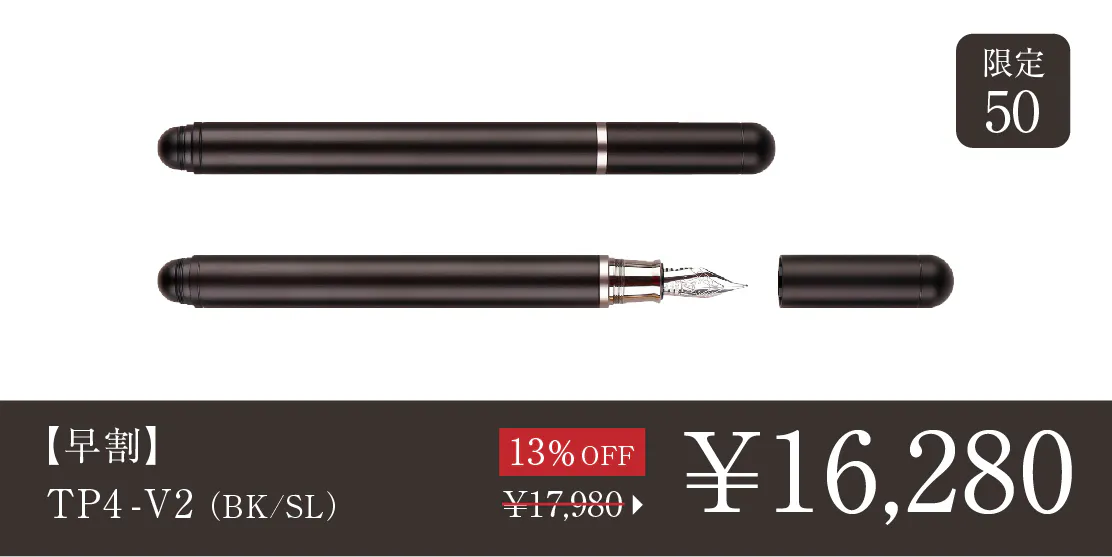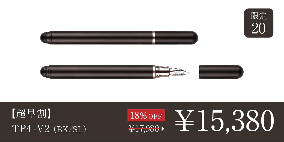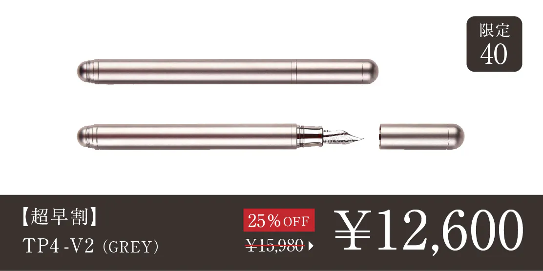 2024/09/04 17:28\TP4シリーズに新モデルが登場/TP4-V2をご支援の皆様皆さまにご支援いただいたTimazeから、新プロダクトTP4-miniが登場しています。TP4シリーズの新モデルとなる、ミニ万年筆です。https://camp-fire.jp/projects/787915/view皆様には改めてのご紹介になりますが、「TP4」シリーズは、シンプルでミニマルな万年筆。手入れをすれば長く使える万年筆を、耐久性もあり腐食にも強い航空機グレードのチタンで作ることで一生モノと呼べる品質に仕上げています。今回の「TP4-mini」は、人気の「TP4-V2」をさらにコンパクトにしたミニバージョンです。ぜひチェックください。TP4-V2の価格据え置きセールについて ※黒ニブを搭載した、ALLブラックモデルも追加されています。価格据え置きで長らく販売してきた「TP4-V2」に関しては、輸入コストの上昇を受け、8月21日を以て値上げに踏み切りましたが、TP4-miniの登場に伴いキャンペーン中。オンラインストアで旧価格の値段のままお買い求めいただけるセール販売(予約注文・9月30日まで)を行っていますので、そちらもぜひチェックしてみてください!https://www.microfactory.jp/products/tp4v2>>オンラインストアもぜひチェックください もっと見る