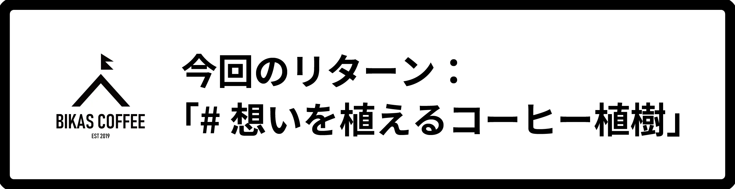 コーヒー植樹を2本していただくリターンです。参加していただくと、ハルパン村で採れたBIKAS COFFEEを豆の状態、もしくはダンク式で、クラウドファンディング限定パッケージにてお届けします。また、合わせて植樹に関する物語「Story of BIKAS COFFEE #3 植樹のコト」の冊子とお礼のメッセージをお届けさせていただきます。さらには3年後、ご自身の木から採れたコーヒーを複数回に分けてお届けいたします。加えて、今回植樹をした皆さま限定のSlackチャンネルへご招待いたします。そこでは皆さまの木のレポートを定期的に送付するとともに、同じく想いを植えたみんなの想いを共有できる場をお届けいたします。また、備考欄にご自身の木に付けたい名前や想いを10文字以内でご記入ください(2本に対して1つの名前をつけることができます)。なお、自分の木からコーヒー豆が収穫できなかった場合は、BIKAS COFFEEが他に植えた木やハルパン村の他の木から採れた豆をお届けいたします。