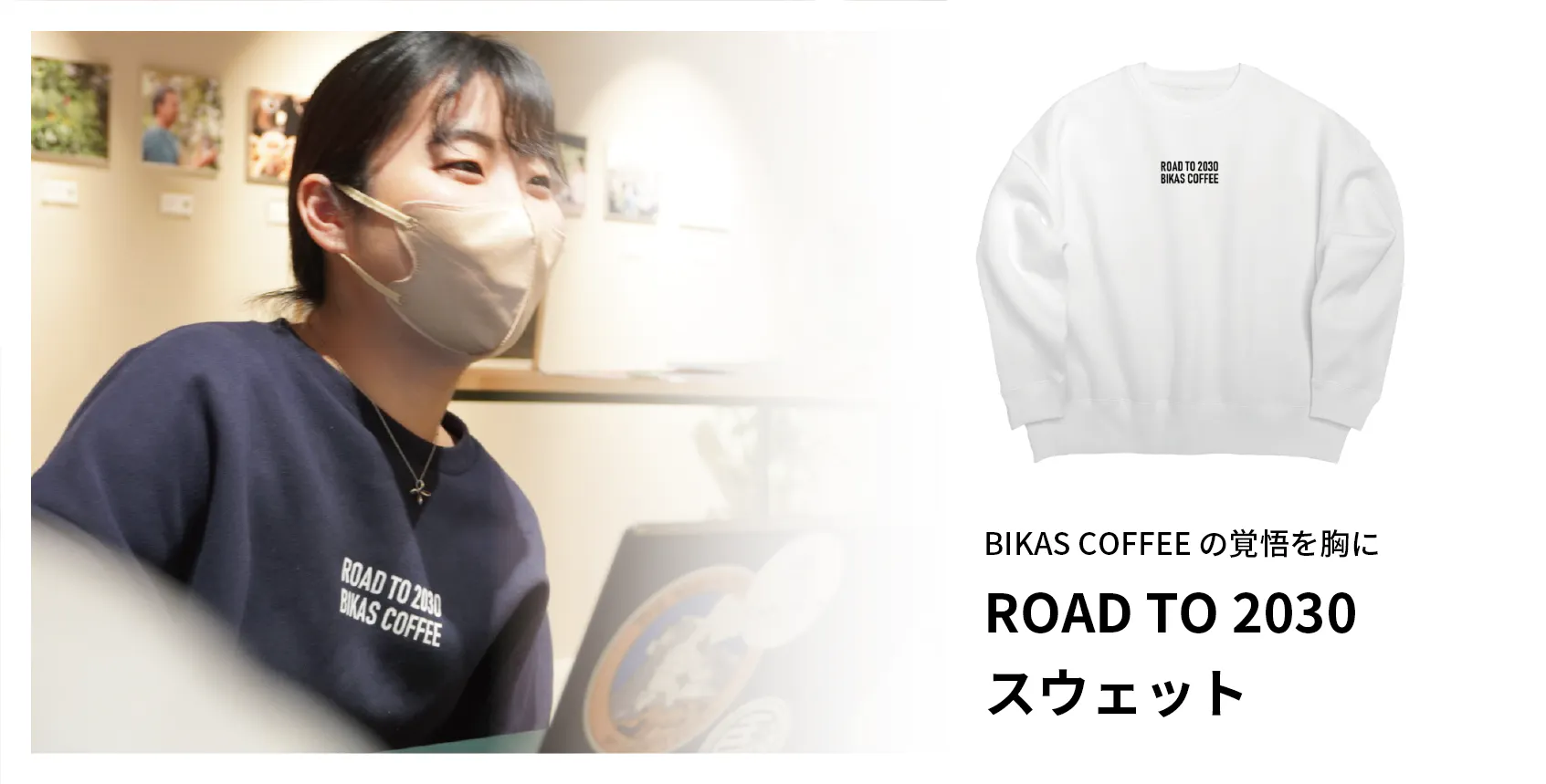 BIKAS COFFEEの覚悟を胸に。ずっと美味しいコーヒーを飲み続けられるように。私たちの営みがもっと発展できるように。そして地球を守れるように。ミライへの約束を込め、2030年までに様々なアクションを起こしていく。そんなブランドの覚悟をスウェットに込めました。ROAD TO 2030 スウェットを手に入れて、BIKAS COFFEEに関わるすべてのヒトが社会に貢献できる新しいミライを一緒につくってゆきましょう。