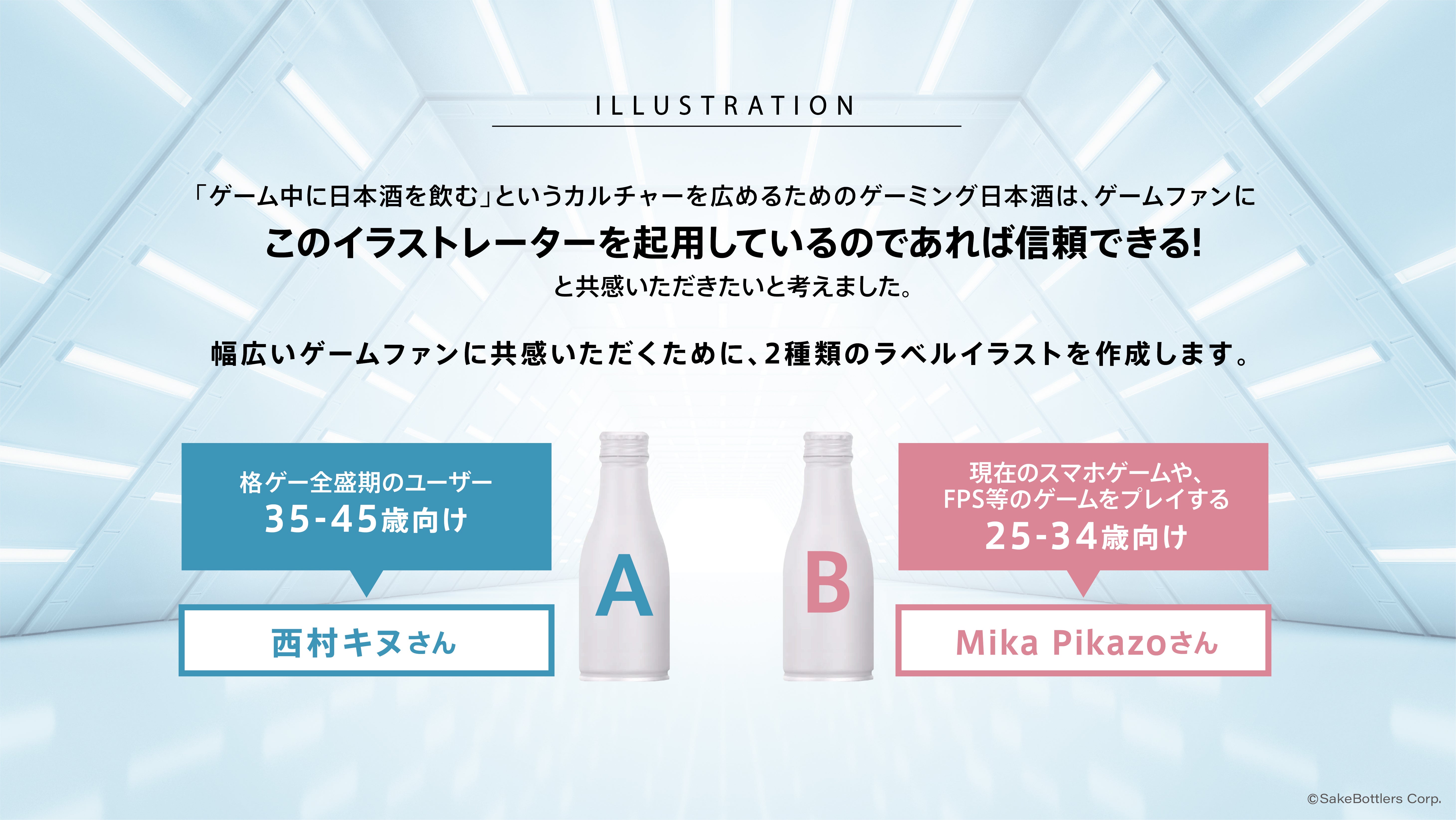 イラストレーターに『西村キヌ』、『Mika Pikazo』を起用し、「ゲーム/レインボー/日本酒」というテーマでのイラストで2種類の日本酒ボトル缶を作成しました。