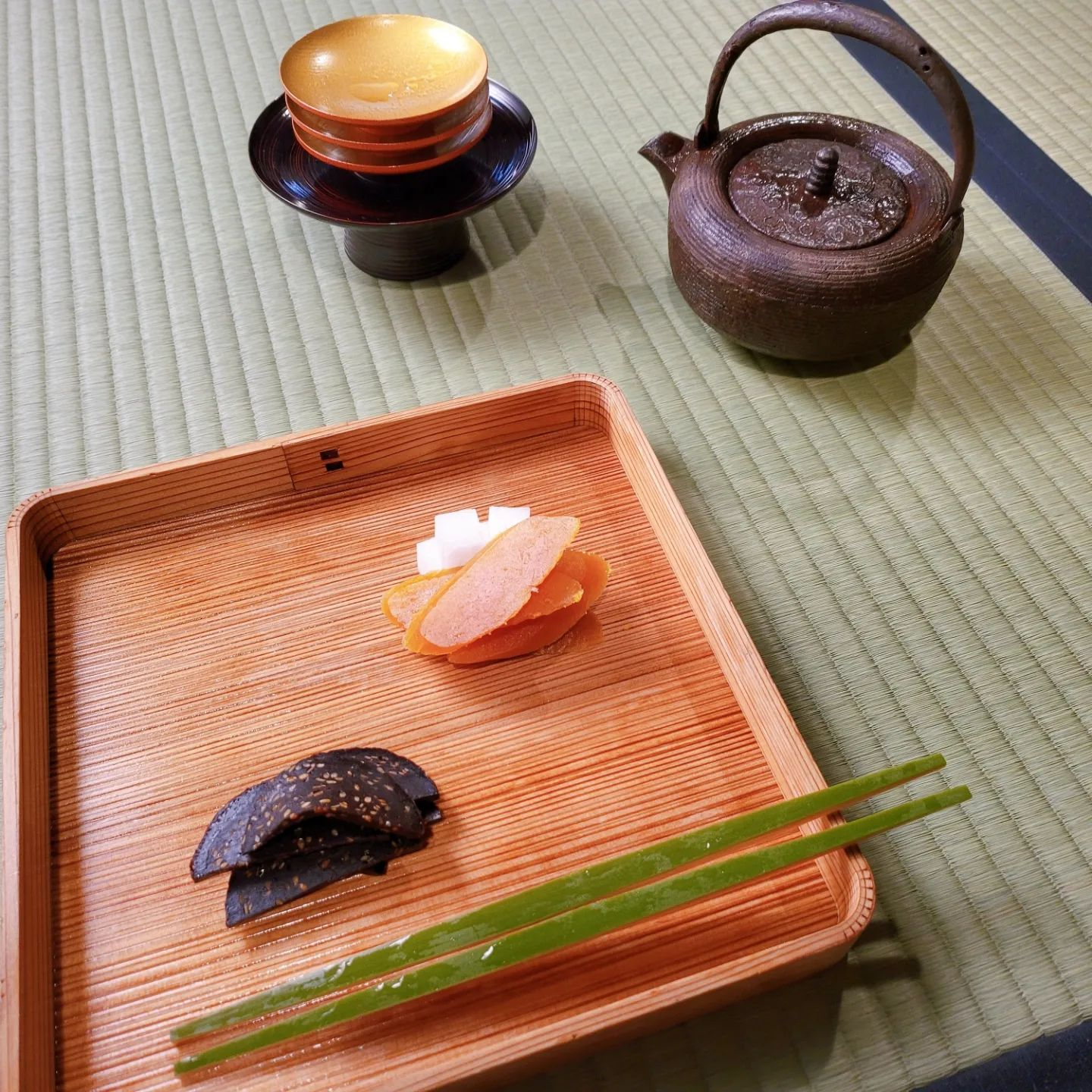 そもそも「茶道って食事が出るんですか?」「お酒飲めるんですか?」と驚かれる方はとても多く、このお酒も日本酒に限らず、ワインやリキュールだってかまわないのですし、生ハムやチーズだって使う事があります。