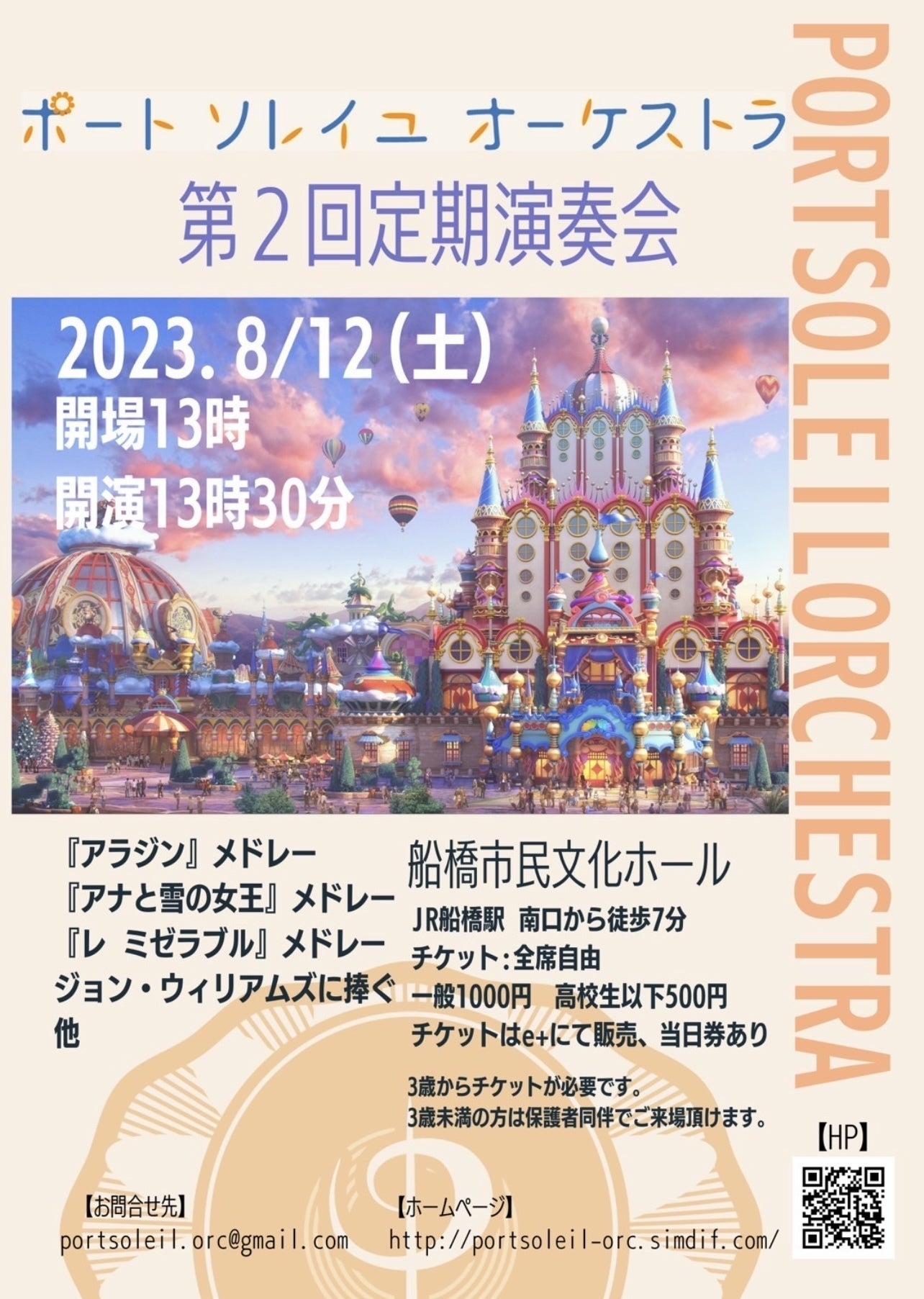 2023/07/21 18:30《ポートソレイユオーケストラ第2回定期演奏会》日時 : 8月12日(土) 場所 : 船橋市民文化ホール開場 : 13:00 開演 : 13:30チケット:全席自由 一般1,000円 高校生以下500円《チケットはe+にて販売中です↓》https://eplus.jp/sf/detail/3891710001-P0030001※当日券の販売もございますが、枚数に限りがございますのでご注意下さい。船橋市民文化ホールへのアクセスはこちら↓https://www.city.funabashi.lg.jp/shisetsu/bunka/0001/0001/0001/p011077.html今回は映画音楽を中心とした、明るく楽しくポップな演奏会を予定しております♪2月の定期演奏会とは雰囲気がガラリと変わりますのでお楽しみに♪文化祭をイメージして準備を進めております!皆様のご来場、心よりお待ちしております!!! もっと見る