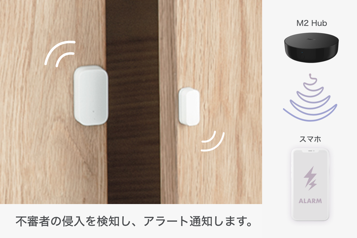 アラームモードをオンにすると、不審者の侵入があった場合に、Aqaraドア・窓センサーがドアや窓が開けられたことを検知し、ハブ M2が即座に警告を発します。スマホにもリアルタイムに通知が届きます。