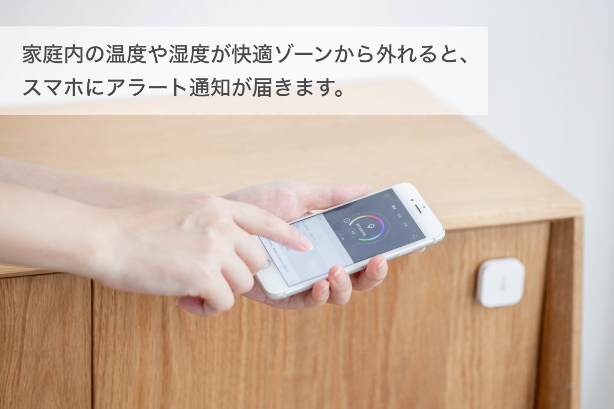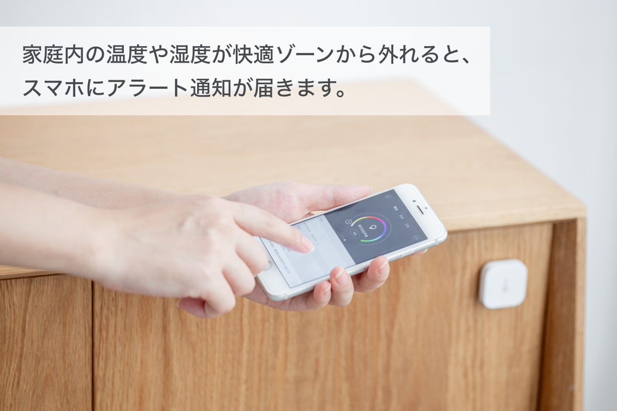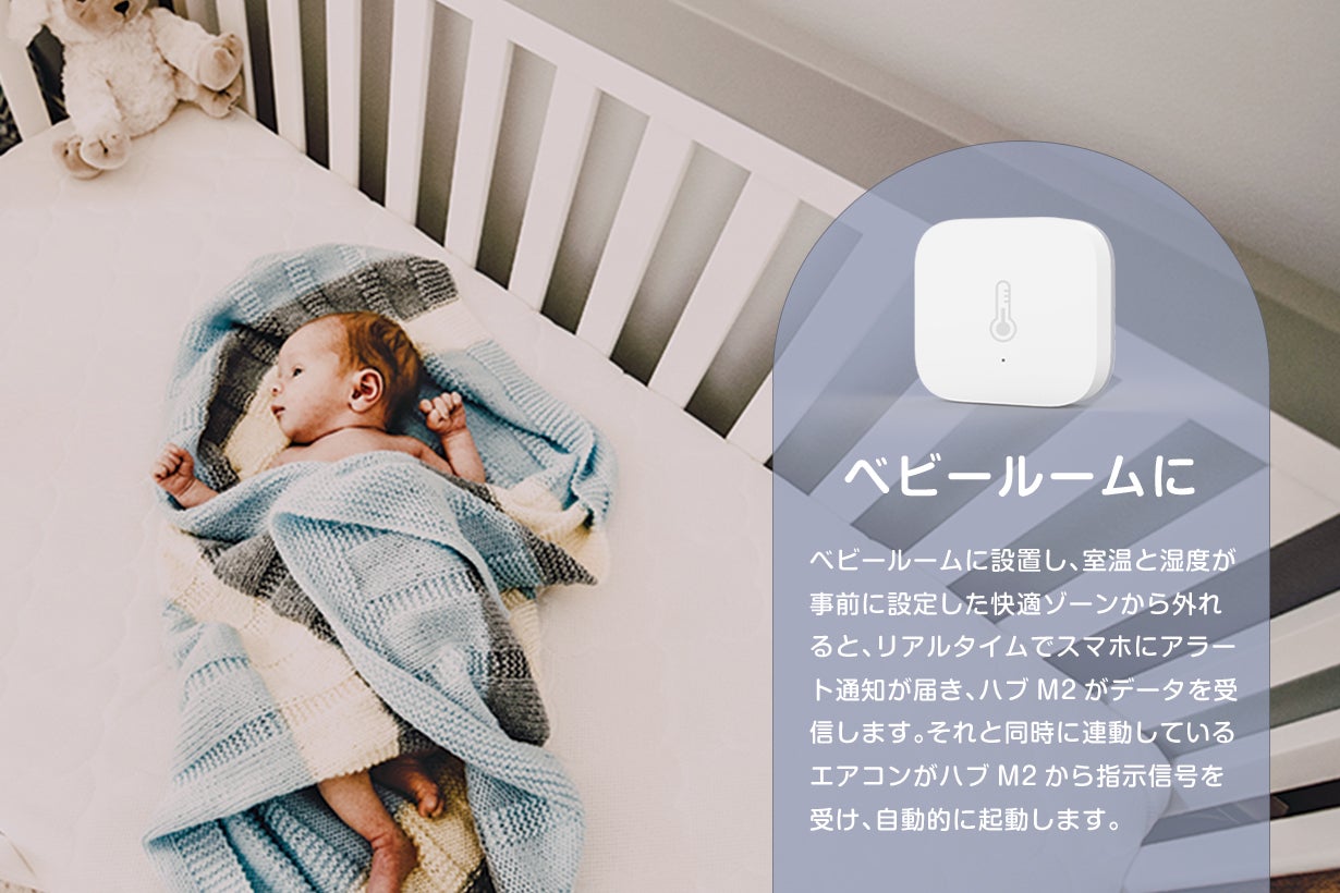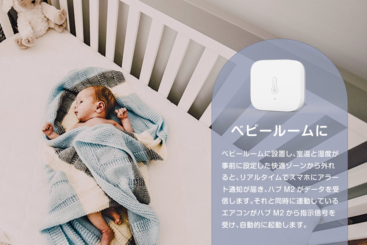 あらゆるところに設置し、温湿度・TVOC数値が事前に設定した数値範囲から外れると、リアルタイムでスマホにアラート通知が届き、ハブM2がデータを受信します。それと同時に連動しているエアコンや空気清浄機がハブM2から指示を受け、自動的に起動します。