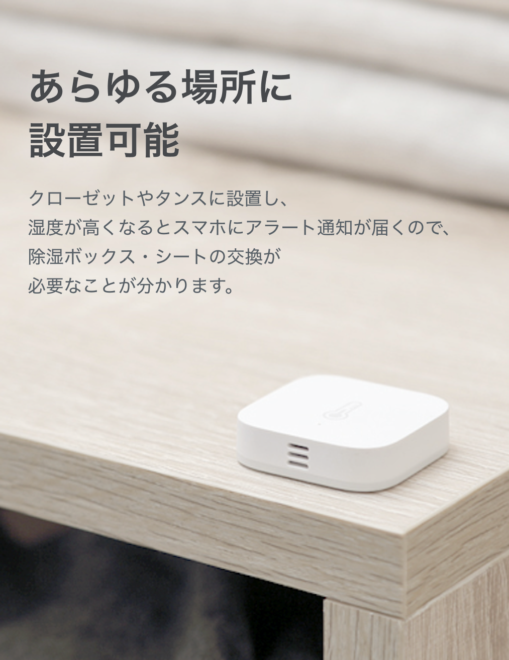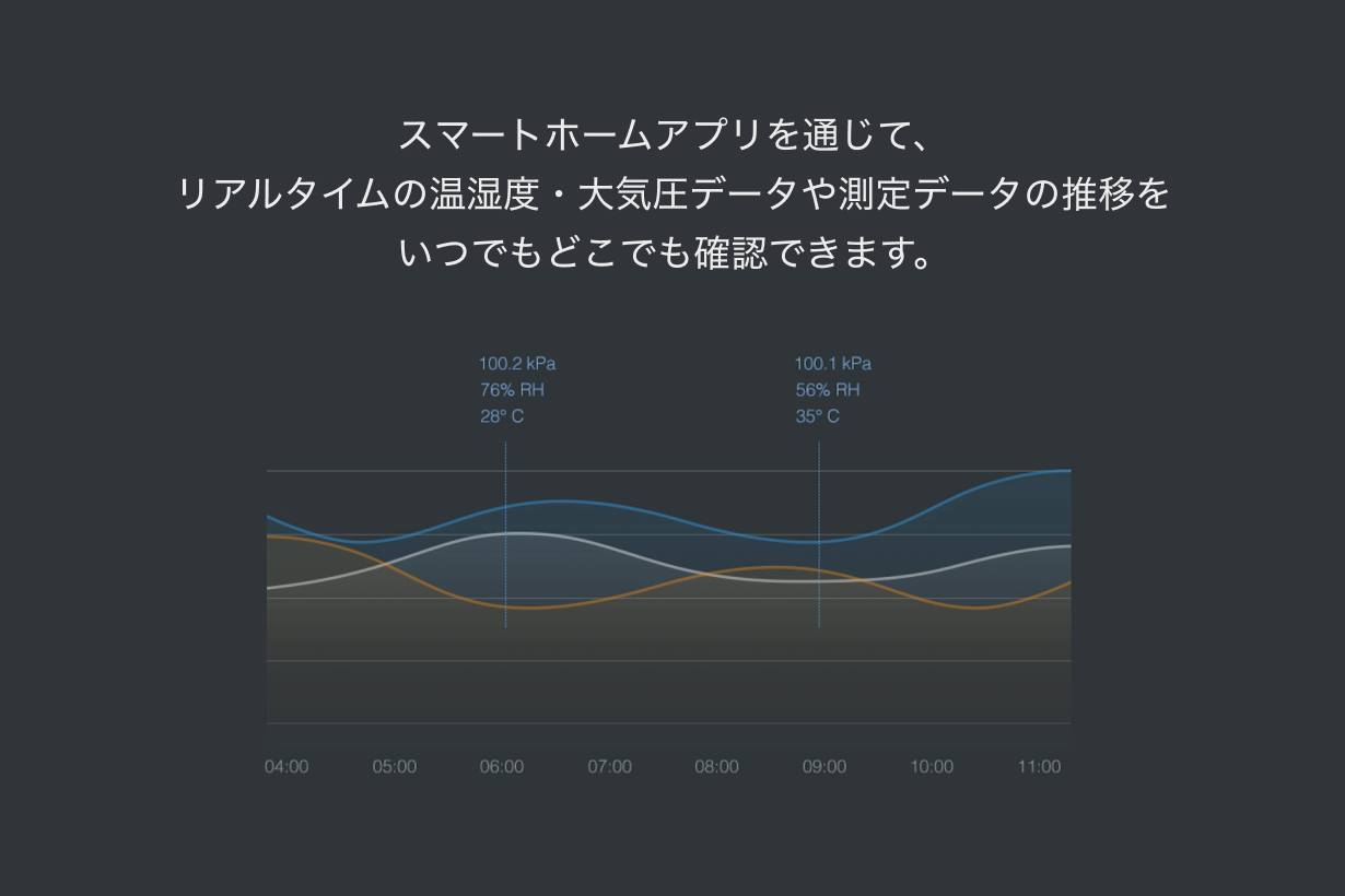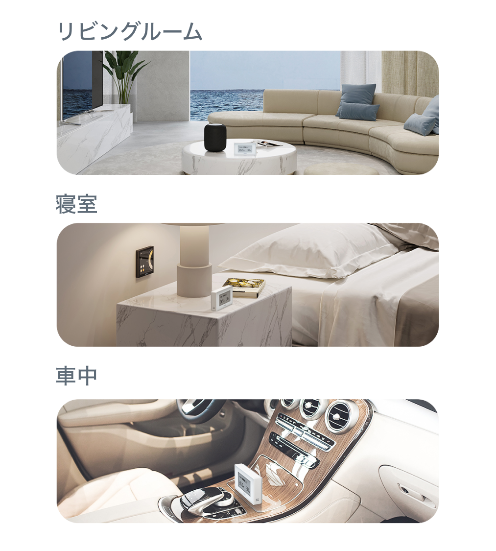 あらゆるところに設置し、温湿度・TVOC数値が事前に設定した数値範囲から外れると、リアルタイムでスマホにアラート通知が届き、ハブM2がデータを受信します。それと同時に連動しているエアコンや空気清浄機がハブM2から指示を受け、自動的に起動します。