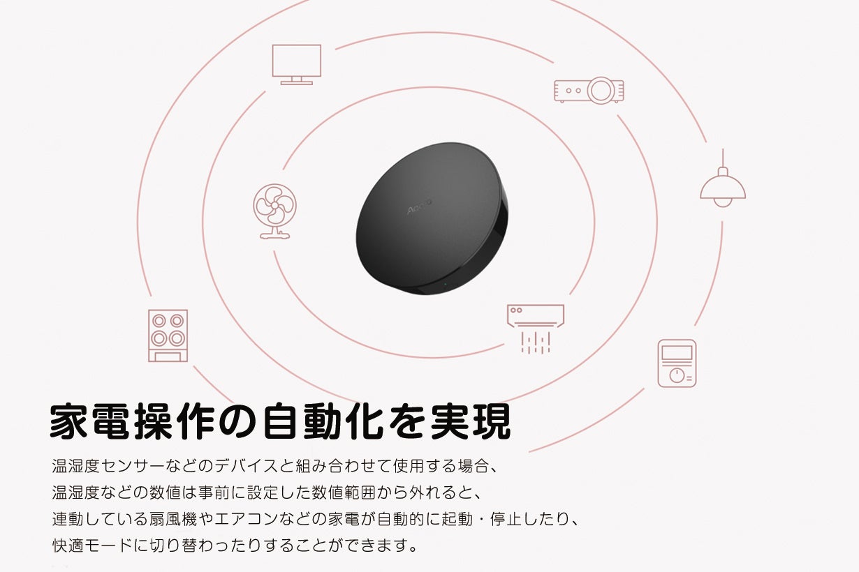 Aqara ハブ M2スマートゲートウェイには赤外線通信モジュールが内蔵されており、赤外線リモコンに対応した家電を遠隔操作したり、オートメーション機能による家電操作の自動化を実現できます。