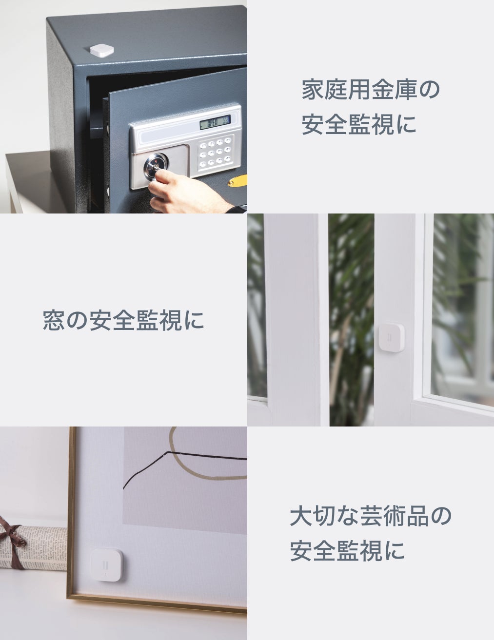 家庭用金庫や窓、大切な芸術品に設置して、落下や傾きなどが発生しましたら、リアルタイムでスマホにアラート通知を送信します。