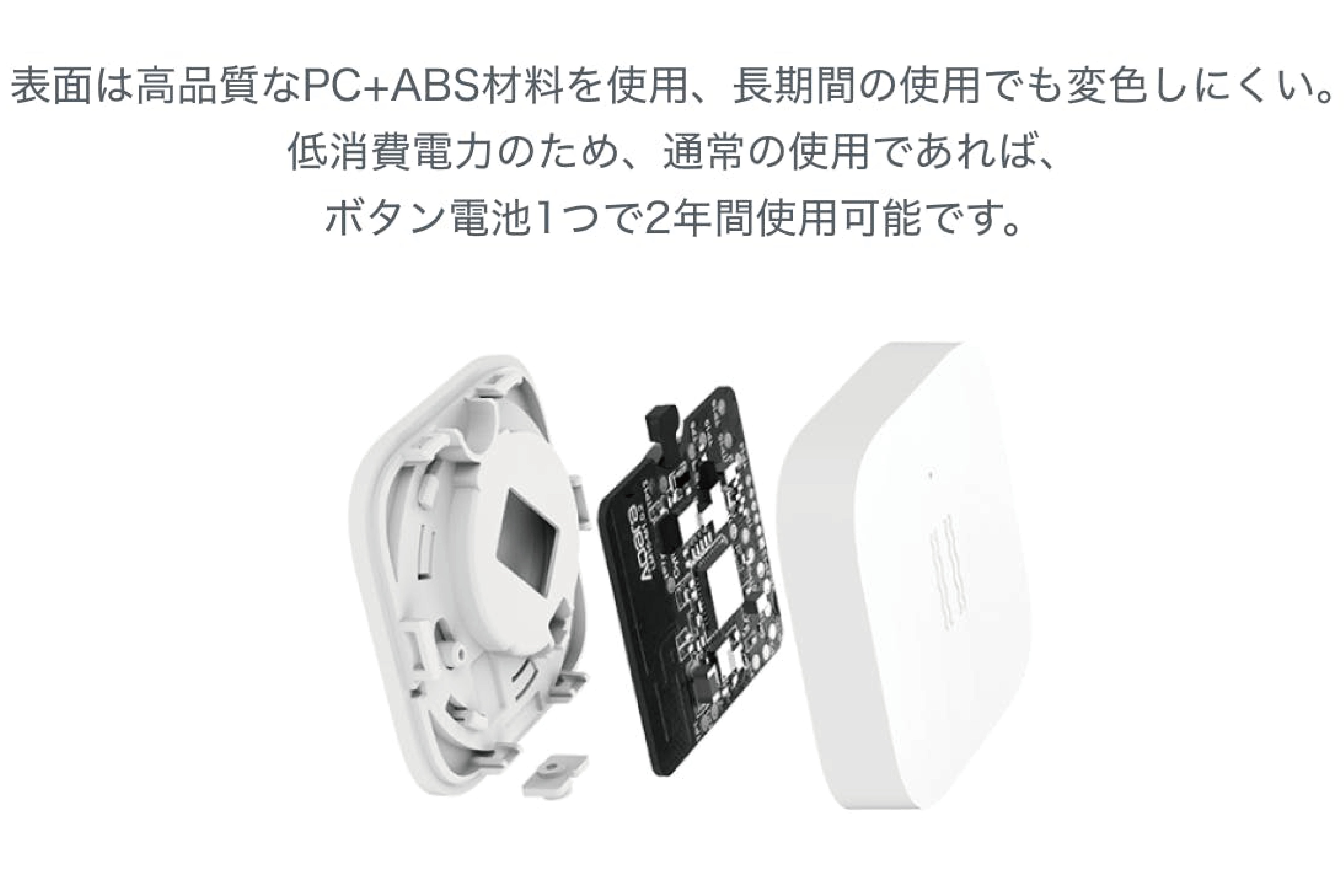 Aqaraドア・窓センサーは、電池寿命が最大2年間のボタン電池を使用し、センサー本体と磁石の接近・離脱により、ドアや窓の開閉状態を判断します。長期間使用しても色落ちしにくく、防湿性が高いので、湿度の高い南国でも問題なく使用できます。
