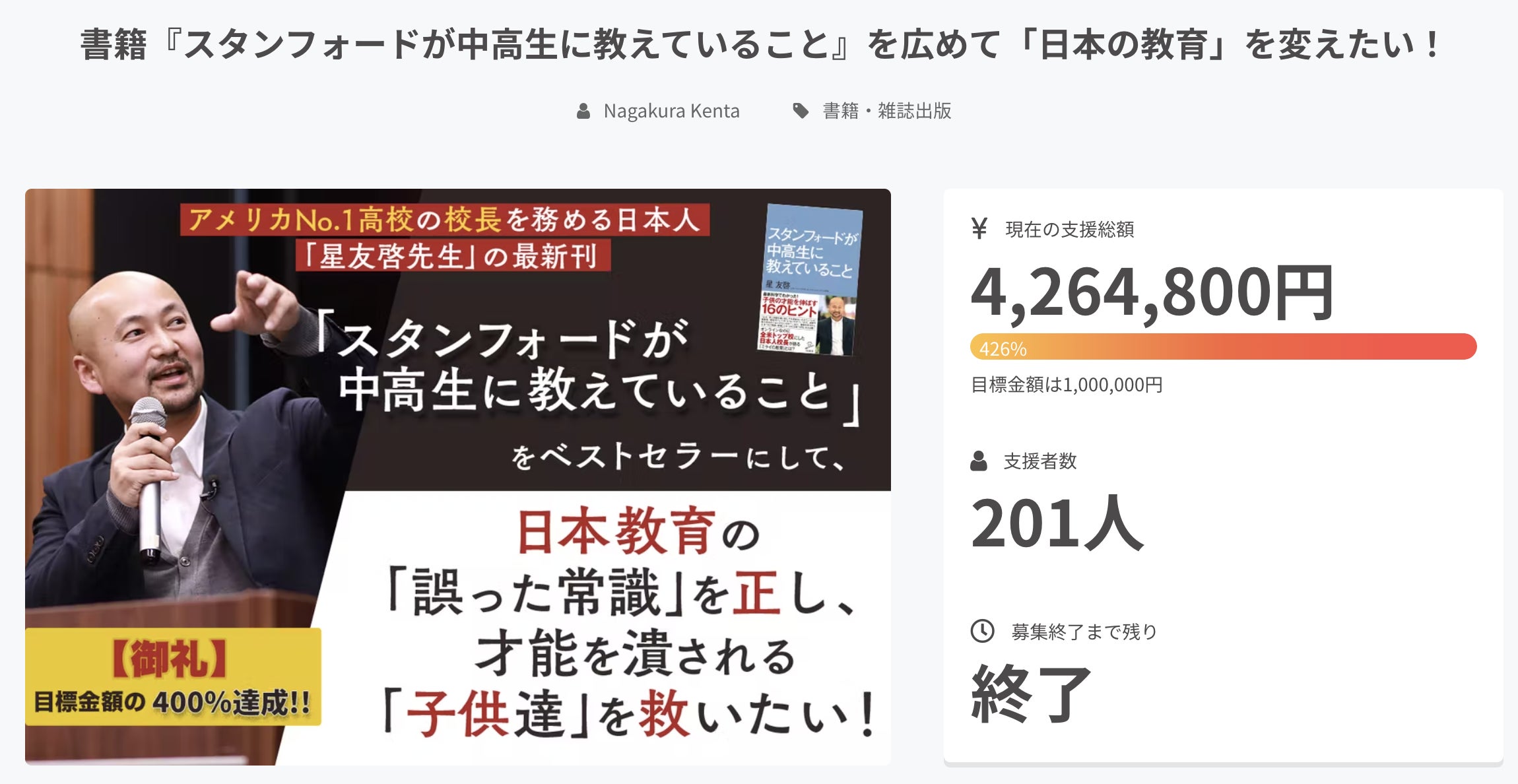 2022/03/08 11:42ご支援いただいた皆様へ。この度、売り切れになっていた人気リターン「星校長のオンライン講演 主催権利」を1枠だけ追加いたしました!その他にも、・長倉とのランチコンサル(4/7)・長倉の講演 主催権利・星校長の各種セミナー映像・星校長のサロン有料コンテンツなどここでしか手に入らないリターンが数多くありますので、よろしければこの期間にお求めください!https://camp-fire.jp/projects/view/564320(ご支援はこちらから)また、「関東と関西で電車広告を出す」という目標に向けて現在ストレッチゴール400%を目指しております!中間ゴールである350%を達成した際にはご支援者さま全員に「未来の教育」「ギフティッド教育」について星校長と長倉がスタンフォード大学で対談した「非売品の映像(約60分)」も提供させていただきます。メンタル問題に苦しむ若者を救うため、日本の未来を少しでも良くするために、最後まで応援いただけると幸いです!https://camp-fire.jp/projects/view/564320(クラファンご支援はこちらから)よろしくお願いいたします! もっと見る
