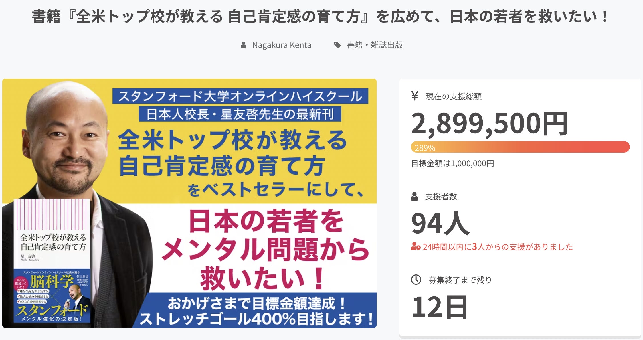 2022/06/30 13:12ご支援いただいた皆さまへ改めまして星校長のクラウドファンディング『全米トップ校が教える自己肯定感の育て方』をベストセラーにして、日本の若者をメンタル問題から救いたい!にご支援いただき、誠にありがとうございました!皆様からいただいたご支援金を使わせていただき星校長の最新刊『自己肯定感の育て方』の電車広告への掲載を実現することができました!ひとえに皆さまのご支援ご協力の賜物でございます。徐々に張り替えが始まっており、以下の路線にて、7月の約1ヶ月間 掲載されますので、ぜひお立ち寄りの際にはご覧ください。<関東>東急東横線・田園都市線・大井町線目黒線・池上多摩川線<関西>阪急線また見かけられた方は、ぜひSNS投稿などで教えていただけると幸いです。引き続き、未来ある若者をメンタル問題から救うための活動に力をいれて参りますので、これからも変わらぬ応援のほどよろしくお願いいたします。————————————————【追伸】週に1回、スタンフォードの特別講義が受けられる!星校長のオンラインサロン「学育ラボ」のご案内————————————————現在、新規メンバー募集中の星校長のオンラインサロン「学育ラボ」ですが、今期メンバー募集が「残り16枠」となっております。星校長の「学育ラボ」では、・世界最新の教育情報・哲学的な問いと見解・大人の学習法・脳科学に基づいたメンタル術・子育て、教育のヒントなどのトピックを、スタンフォードOHS星校長ご本人が解説していきます。「世界の教育の最先端が知りたい」「子育ての疑問を解消したい」「より良い教育を子供に提供したい」「メンタル術を知って自分をコントロールしたい」「正しい大人の勉強法を知りたい」さらには、「日本の教育を変え、若者の可能性を引き出したい」「星校長と一緒に日本の教育を考えていきたい」と思っている方は、ぜひ、この機会にご参加くださいませ!https://community.camp-fire.jp/projects/view/221282(詳細 & ご参加はこちらから)それでは暑い日が続いておりますのでくれぐれもお身体ご自愛くださいませ。 もっと見る