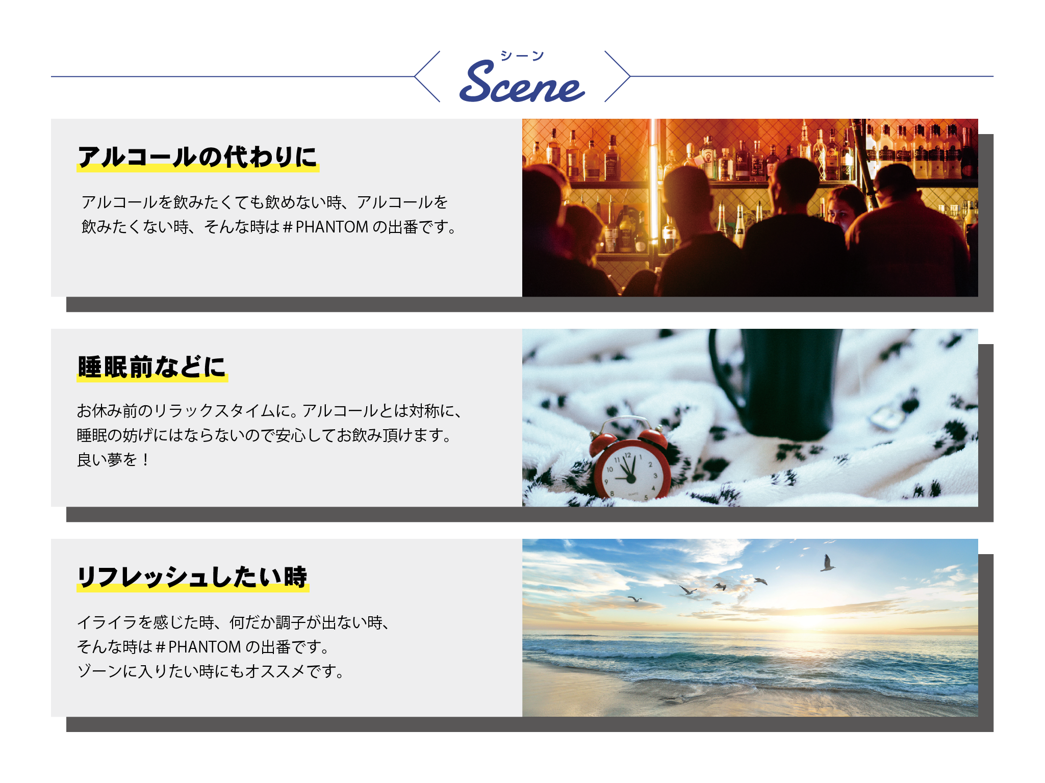 飲んでほろ酔い気分になっても次の日には跡形もなく消えており、そこに残っているのはリラックスタイムを終えた体のみ。そんな幻影(ファントム)に騙されたかのような体験をしていただきたく名付けました。