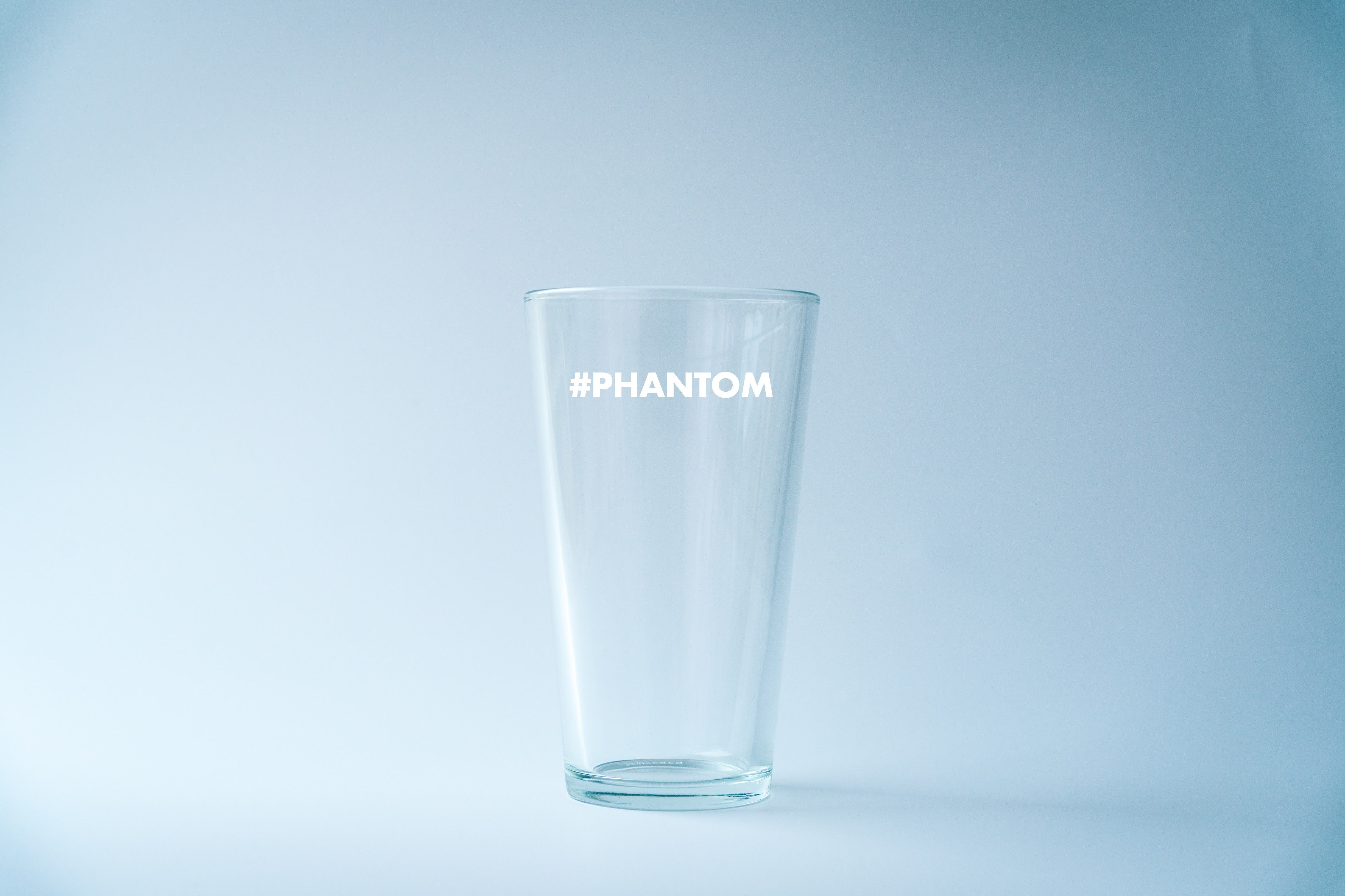 #PHANTOMの製造を記念して、オリジナルのグラスを作成します。容量500mlの強化ガラス製グラスで、#PHANTOMのロゴをレーザー刻印(もしくは印刷)であしらっています。#PHANTOMの美味しさや喉越しを引き出すグラスとして最適のサイズです。