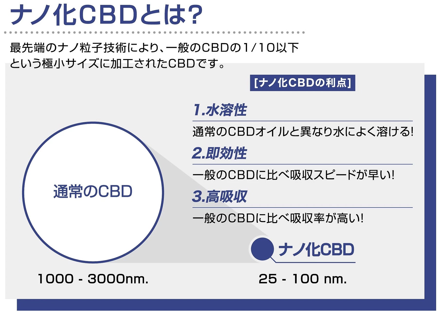 CBDは通常粉末なのですが、このままですと水に溶かすことは困難です。パートナーのCBD Nihon社の協力により、ナノ化CBD(通称水溶性CBD)の調達に成功しました。CBD Nihon社はアメリカの最新テクノロジーでナノ化されたCBD原料を、日本で独占的に販売しております。これによりCBDを飲料の風味を損なうことなく完璧に溶かすことが可能となりました。また水溶性CBDは単に水に溶けるだけではなく、通常のCBDに比べ高い吸収性や体内利用率の増加などが見込めます。これまでCBDを試してみたけどどうもよく分からなかった、という人にこそ試して頂きたいです。