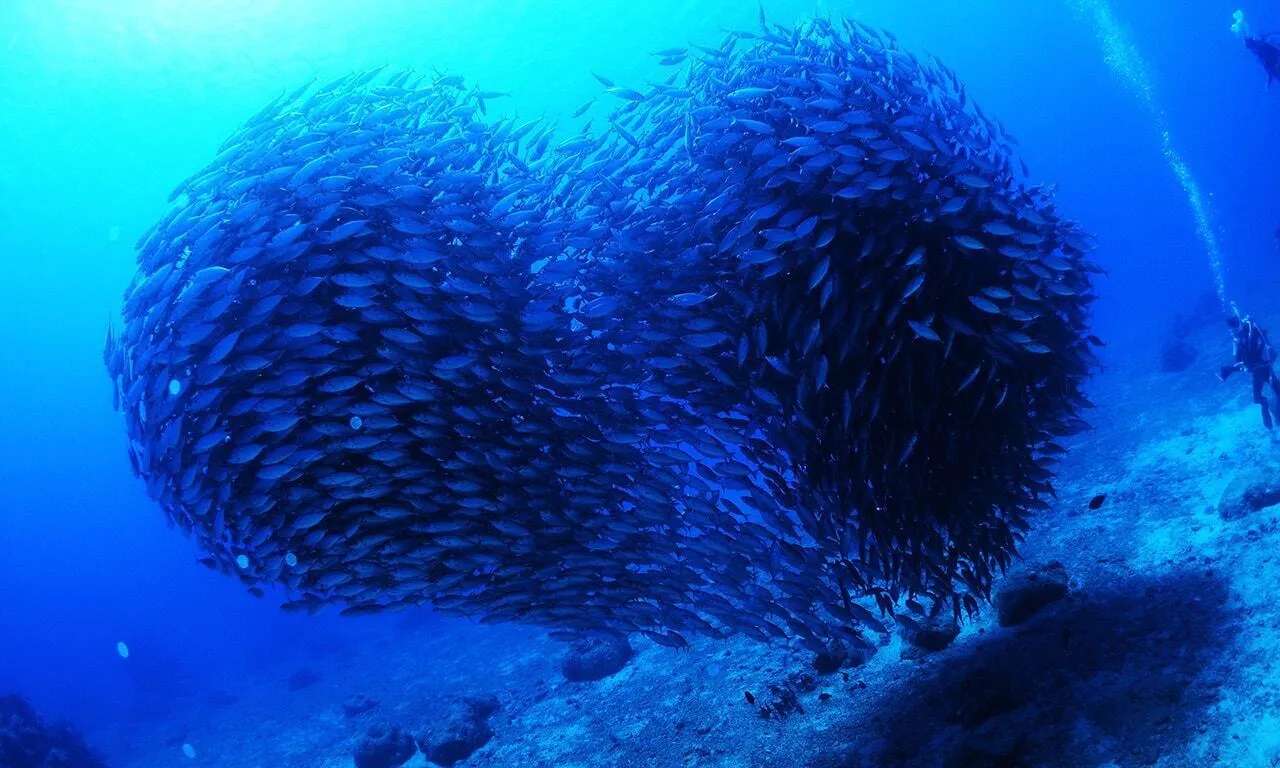 そして都市圏から1時間ほどの距離にありながら、ダイバーやスノーケラーを楽しませてくれる美しい水中景観が広がる白崎の海。隊列をなして優雅に泳ぐハタタテダイ達やメートル級のツバクロエイが砂地で休んでいる姿を見ることが出来ます。時に無数のキビナゴの群れを切り裂くようにツムブリやハマチのアタックシーンをスノーケリングで見ることが出来るのも白崎の海ならではです。