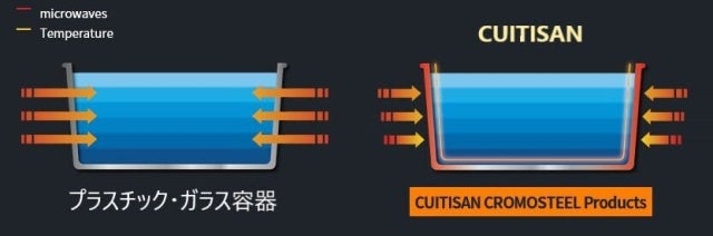電子レンジで使用できるようステンレス素材・厚み・形状化を最適化することで電磁波の反射を低減させています。そしてCRMOSTEELが電磁波を吸収し温度を蓄えるような原理となっています。