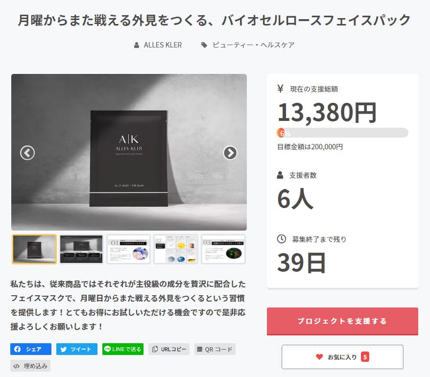 2022/10/23 19:42皆さま、こんばんは!あっという間に週末が終わってしまいますね。。いかがお過ごしでしょうか?「ALLES KLER THE MASK」がより多くの皆さんに手にとって頂けるように、と始めた製造・販売(開始予定は11月)・クラウドファンディングですが、、本クラウドファンディングは早いもので開始から約一週間が経過しました。開始から日々応援してくださる方が増え、大変喜ばしく思っておりました…ありがとうございます!!============================~商品開発のウラガワ~さて、商品開発を始めたのは今年の春頃。複数の製造業者の方とお話しし、検討を重ねたのちに、今お世話になっているOEMの方との素晴らしい出逢いがあり、ALLES KLER THE MASK の製造がスタートしました。市場に出ているパック(競合商品)を何種類も買い、試し検証していましたが、どこか違う。化粧品にお詳しい方であれば経験されたこともあると思いますが、ー翌朝の顔の調子が、いつもとまるで違うーそんな嬉しい驚きの経験をされたことはないでしょうか?我々は、その感動だけは譲れない。と強いこだわりを持ち、商品開発を進めました。その結果として出来上がったのが、この「ALLES KLER THE MASK」です!!”一度経験すると、他のパックに戻れない””使うと必ず誰かにおススメしたくなる”と自信を持って言える程、納得いくものができたと自負しております。どうか、このCAMPFIREで出会った皆様に一度我々の商品を試し「翌朝の変化」を感じてみて頂きたいのです。。!この先もキャンペーン終了まで、まだ38日!ですが、どうぞご贔屓、ご支援いただけますと幸いです!SNSやLINE等で周りの方へご紹介もお願いします!^^最後までご覧いただきありがとうございました!明日、月曜日からお仕事の方も多いと思いますが、皆さまにとって素敵な一週間となりますように!!ALLES KLER もっと見る