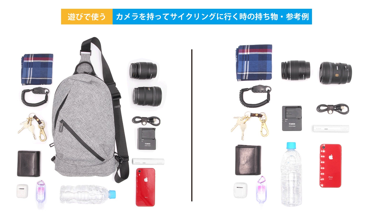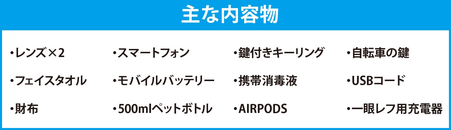 カメラを持ってサイクリングに行く時を想定した内容物になります。