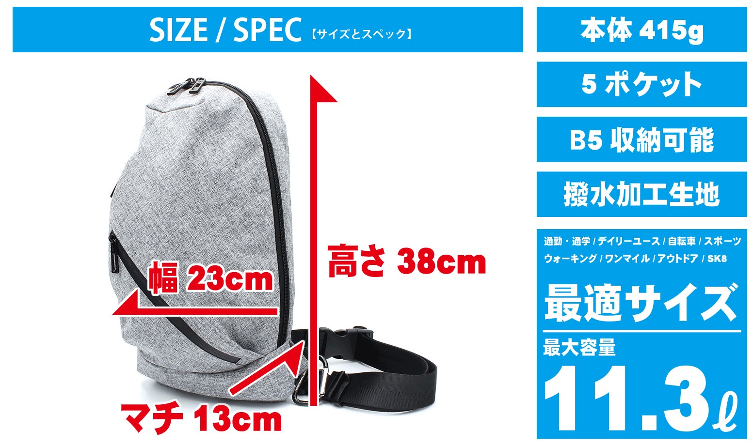 11.3Lの容量を確保しながらも本体重量415gと中々の軽量化ができています。
