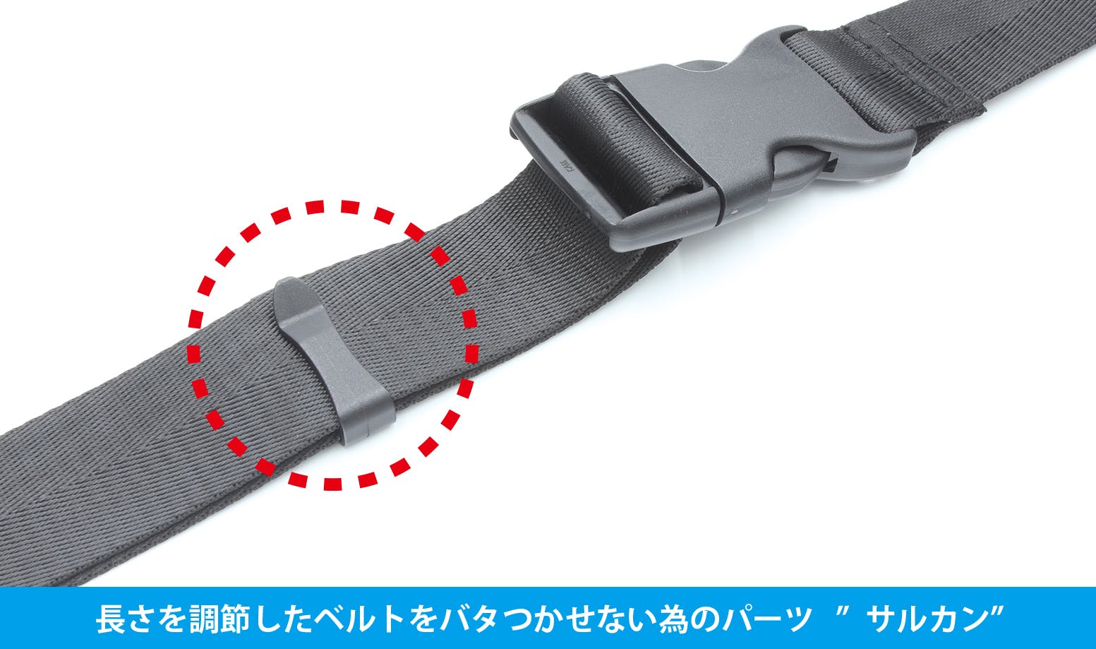 ベルトの中間にアジャスタブルバックルを使っているので、クイックに着脱できます。