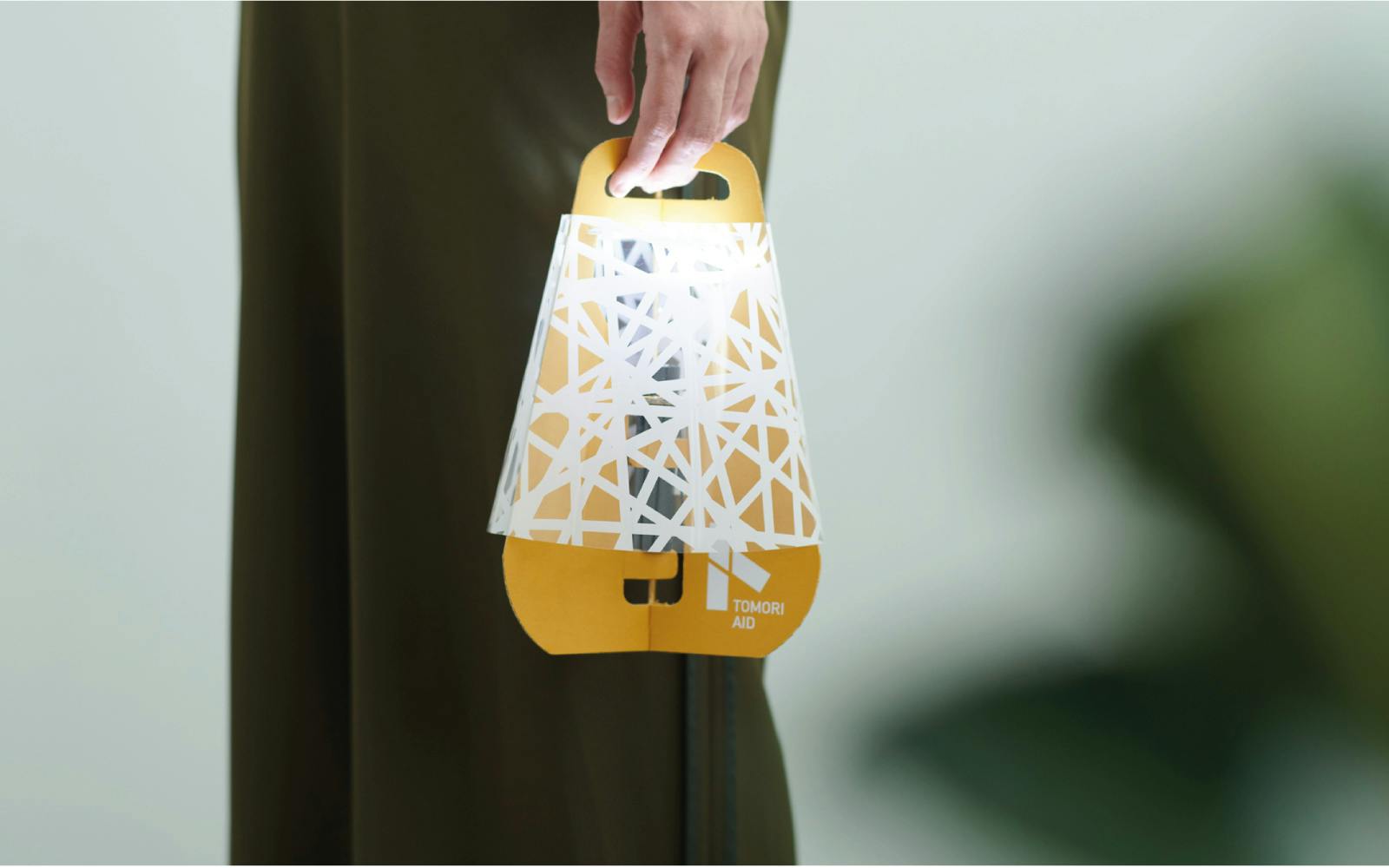 このTOMORI AIDは、 組立てて懐中電灯を中央に入れる事で、懐中電灯の直線的な光をランタンのやわらかな光にできる照明キットです。 年々、日本中全ての人にとって「ひとごと」ではなくなってきている自然災害。デザイナー自らも東日本台風で避難を経験し、デザインのちからで非常時のあかりの不安と問題を解決できないかと考え、このTOMORI AIDを開発しました。