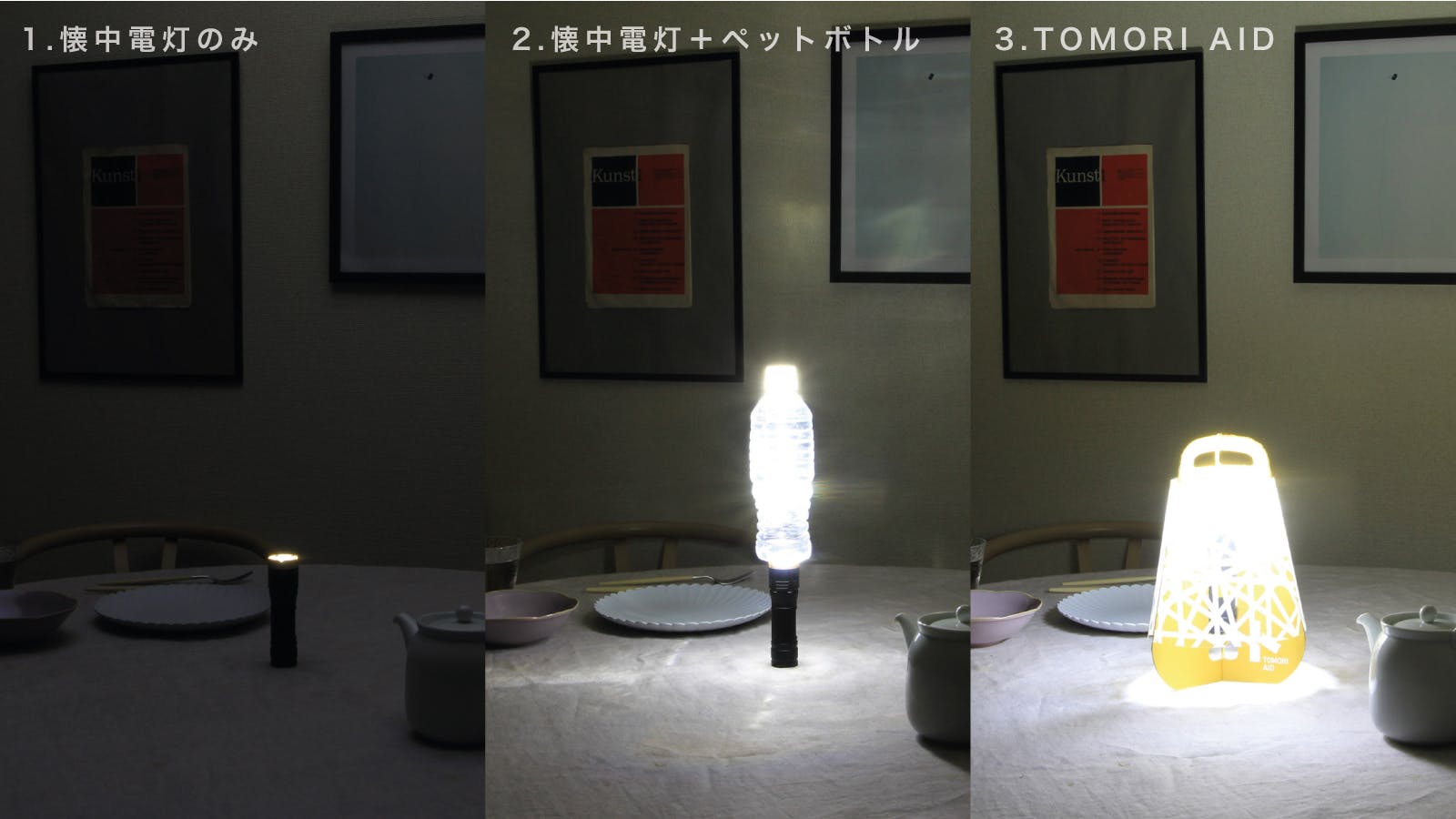 なぜTOMORI AIDを考えたか、というと私自身が2019年台風19号による多摩川決壊危機の際に避難所への避難経験をしたからです。豪雨の中での避難は想像以上に大変で、準備していた防災バッグから最低限必要なものを選んでバッグに詰めて避難所へ行きました。避難所では多くの人々が間隔を隔てる事無く密集している状態でした。そして夜、消灯時間となり半分の体育館の照明を落としたのですが、トイレはホールから出た廊下にあるので明かりを付けて下を気にしながら歩かなければなりません。懐中電灯を照らすのですが光が直線的で強く、周りの人達にもまぶしく感じさせてしまいます。皆緊急事態で極度の不安の中、使う人にも使われる周りの人にもさらにストレスをかけてしまう状況を目の当たりにしました。 さらに同年の台風15号の千葉での停電被害時にはニュース番組やSNSで水を入れたペットボトルを上にのせる方法が拡散していました。この様に懐中電灯は持っていたけどランタンの様な間接的なあかりにしたい、という切実な要望が実際の現場にはあるのだと認識し、改善する為に開発に着手しました。