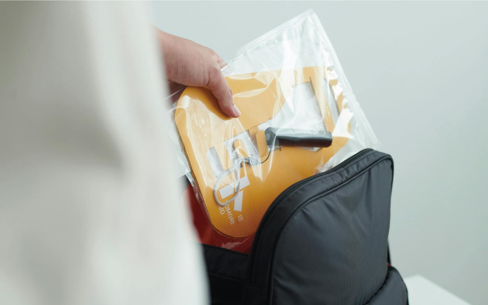 TOMORI AIDは本体を段ボールでつくる事で軽さと曲げの強さを実現しながら、折り畳めばA4サイズに納まる設計によって逃げる時にバッグに入れる必需品の邪魔にならない事を可能にしました。もちろん家でしまっておくにも場所をとりません。