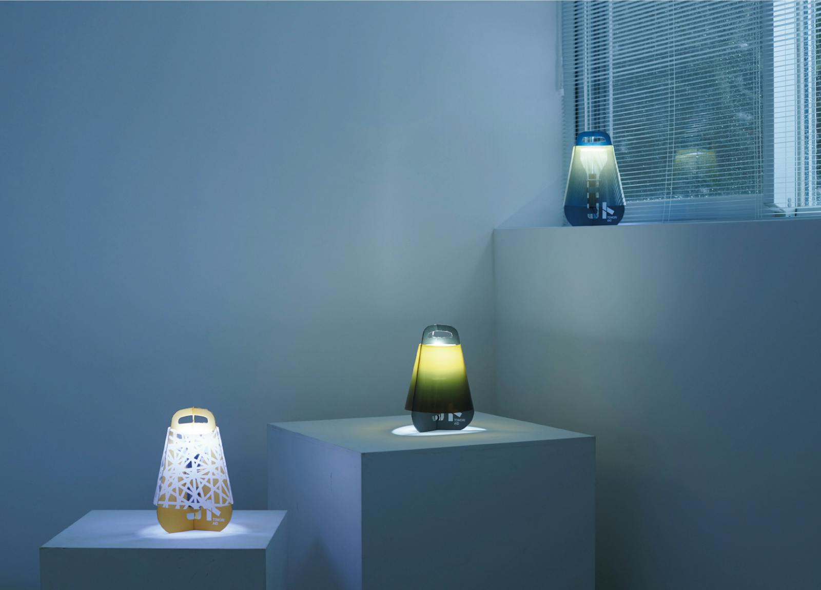 本体の素材は軽く曲げに強い段ボール、カバーは強度と光の透過が美しいポリプロピレンです。本体カラーはイエロー/ブルー/グレーの3種類とカバーもそれぞれのカラーに合わせたデザインとなっています。それぞれ光り方も違うので日常の様々なシーンやインテリアに合うようデザインしました。