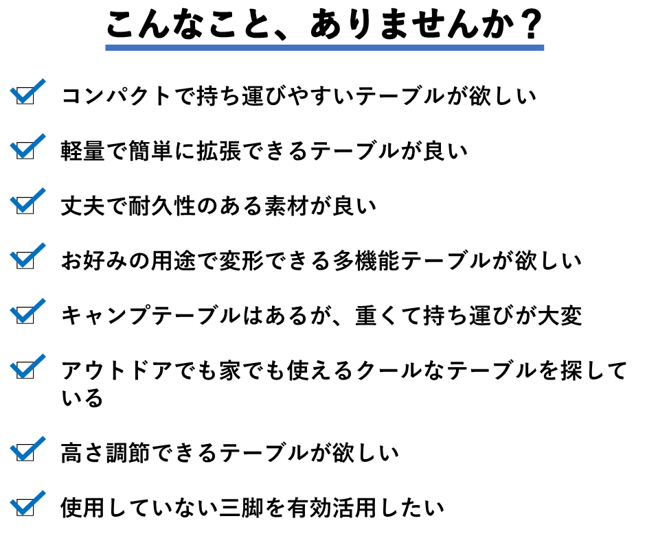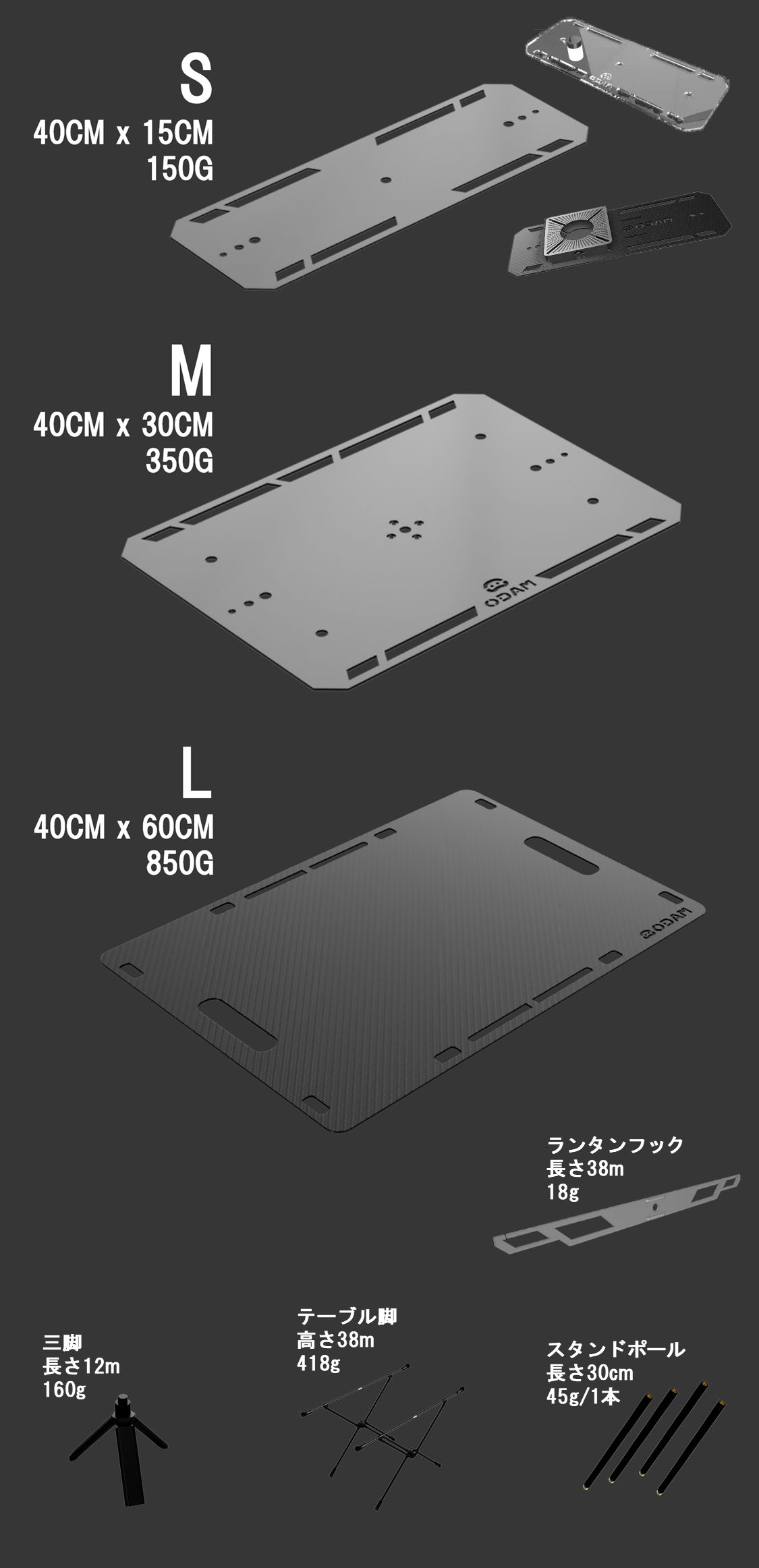 アウトドアテーブルのギアは、高強度・軽さ・携帯性・拡張性の4拍子揃った機能的な作りとなっています。初心者の方で使いやすい粘度で、高い操作性を誇ります。なのにしっかりとした強度もあるので、初心者からプロまで多くの方にご愛用されております。皆さまから頂いたご意見等を参考しながら、商品の改善や向上、魅力あるアウトドアテーブルに反映してまいります。