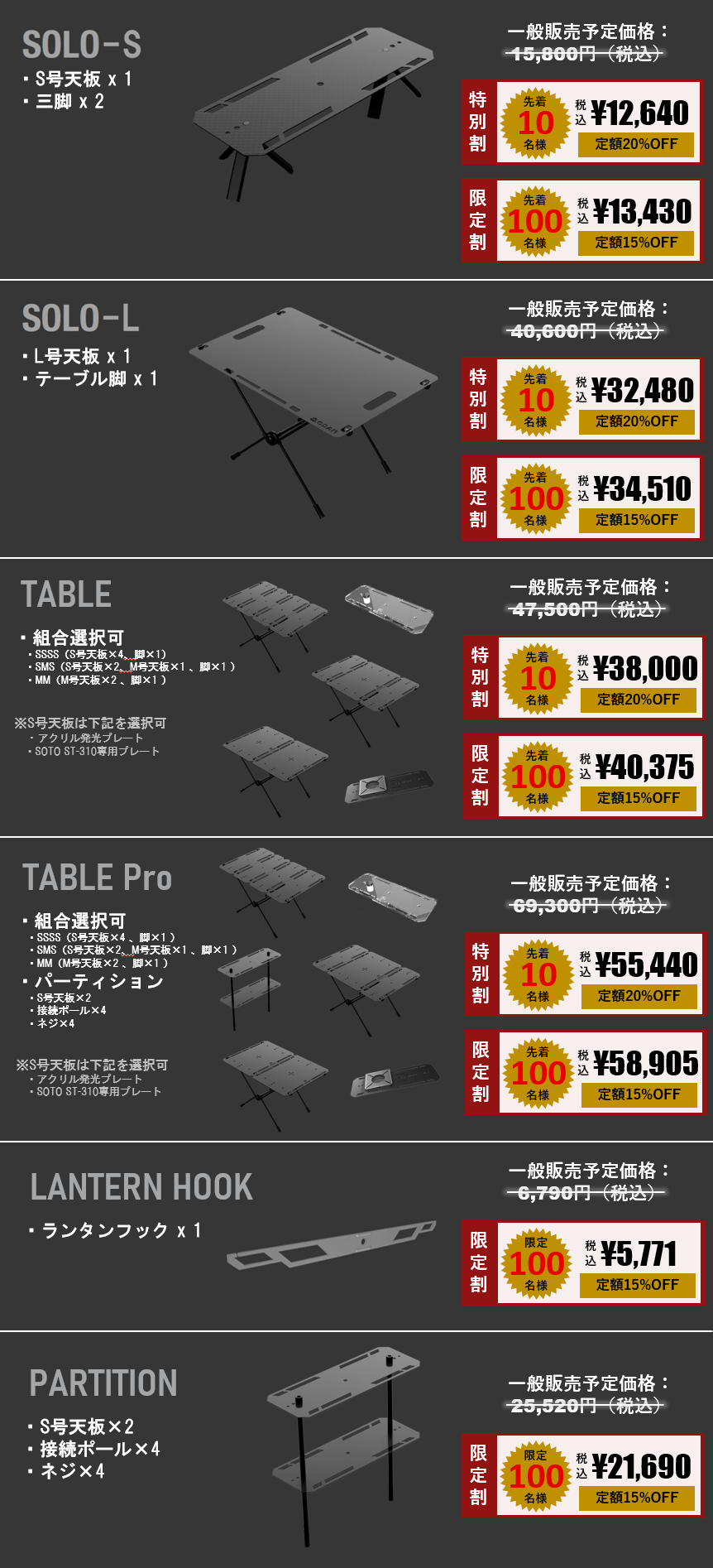 2022/08/24 17:47SOTO専用プレートをご購入されたお客様お世話になっております。この度、SOTO専用プレートに対して、何度も仕様の変更と改善を実施して、ようやくST-310新旧版両方、およびST-340にうまく対応できるようになりました。SOTO専用プレートのセッティング方法及び注意事項について共有させていただきたいと思います。下記の動画をご覧くださいませ。ガス缶を固定するために、マグネットと粘着式ベルトを利用しております。二つともプレートと一緒に送付させていただきました。動画に説明させていただいた通り、SOTOのシングルバーナーを使う際に、鍋等の重心がずれないようにご注意する必要があります。正しくご利用していただければ、荷重5㎏以上でも問題ございません。しかし、危険防止のため、粘着式ベルトのご利用はお勧めです。(もちろん、マグネット利用せず、ベルトのみでも利用可能)使い方は人によって違うかもしれませんので、マグネットを装着していない状態で送付させていただきました。マグネットの装着方法については、強力な両面テープで貼り付けていただきますようお願いいたします。また、商品についてのご感想・ご意見などございましたら、ぜひご共有していただければ幸いです。皆さまから頂いたご意見等を参考しながら、商品の改善や向上、魅力あるアウトドアテーブルに反映してまいります。今後ともよろしくお願いいたします。 もっと見る商品発送完了のお知らせ