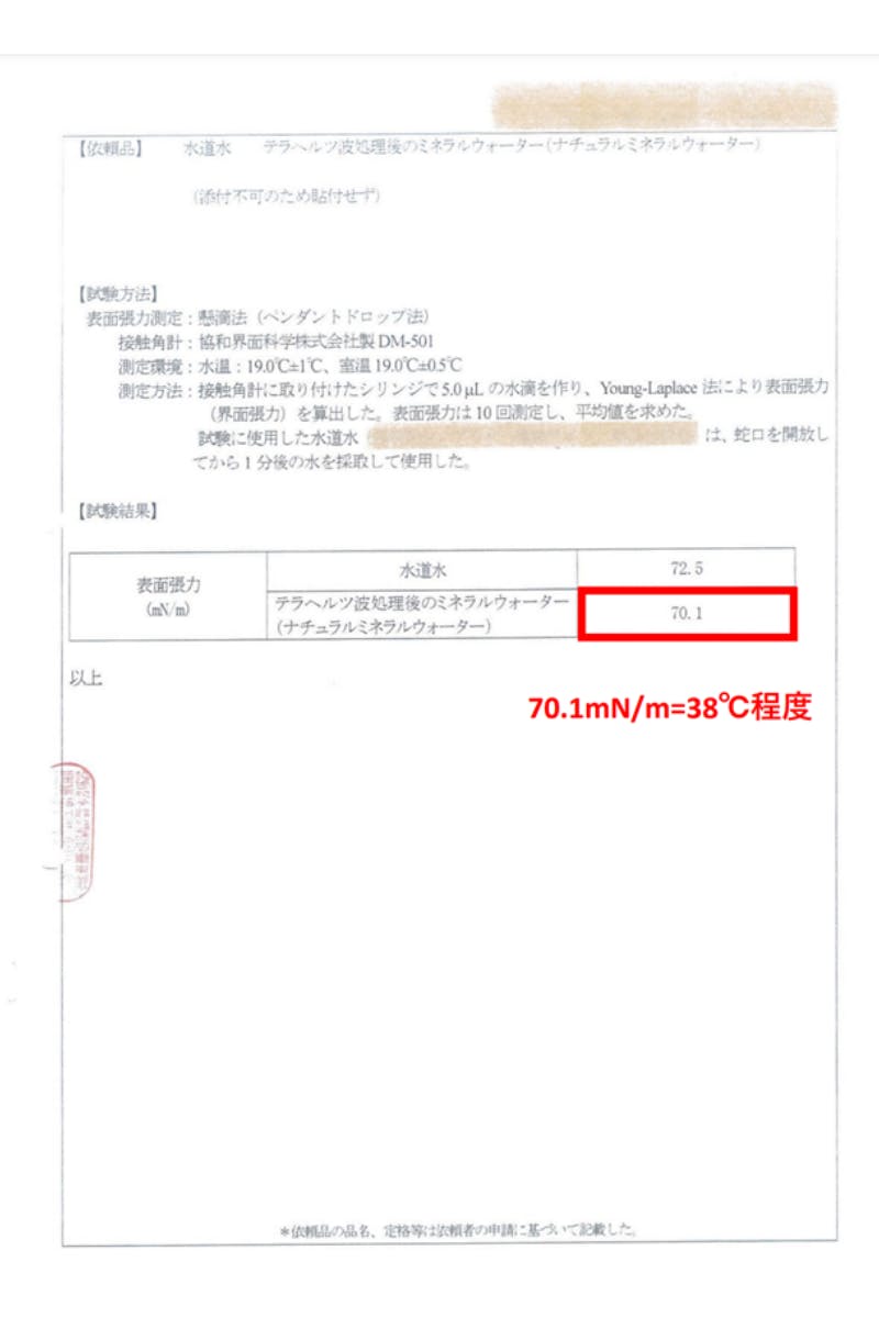 TERAQOL加工をした水の表面張力は、常温で38°Cのお湯と同程度です。 38°C程度のお湯は、表面張力が低いため物質が溶けやすくなり、コスメの主要成分である水分と脂分や他の物質などが溶けやすくなり、これは親和性向上に繋がります。