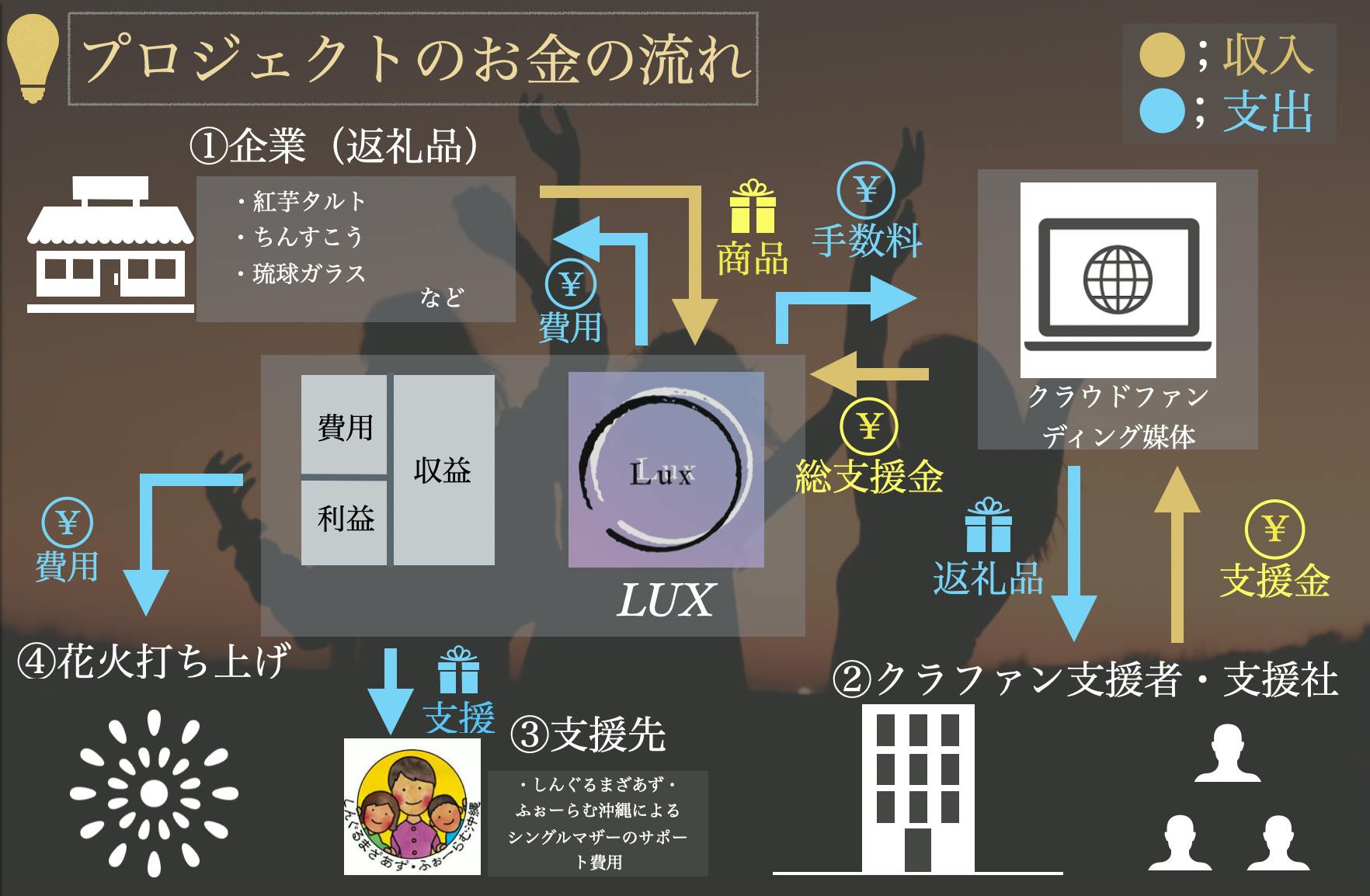 5. 支援金の一部を使って打ち上げ花火を行い、沖縄の花火業者への支援と共に沖縄県民に笑顔を届けます。