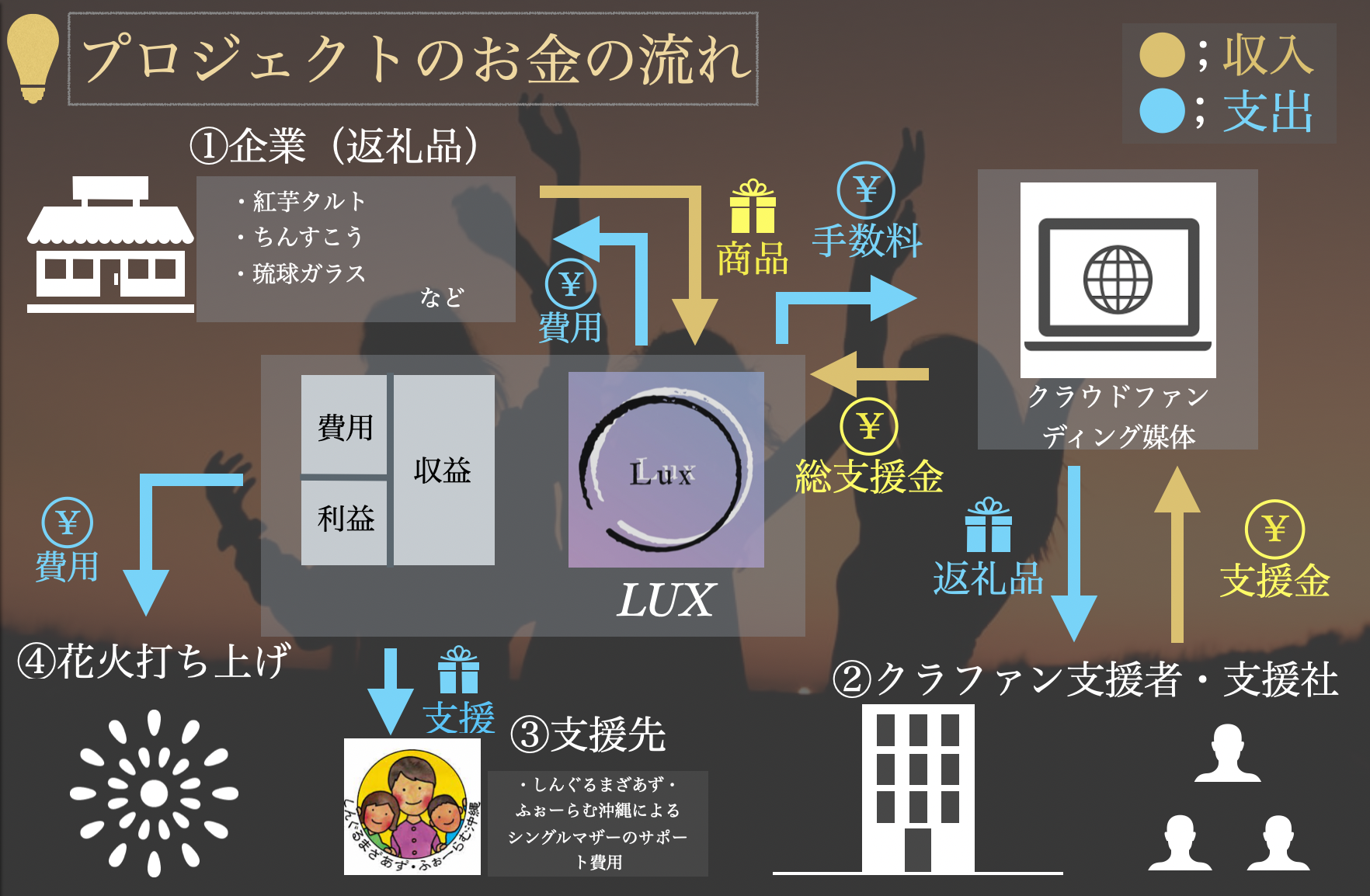 目標額以上に支援金が集まった場合、花火打ち上げ費用とシングルマザーサポート費などに回します。