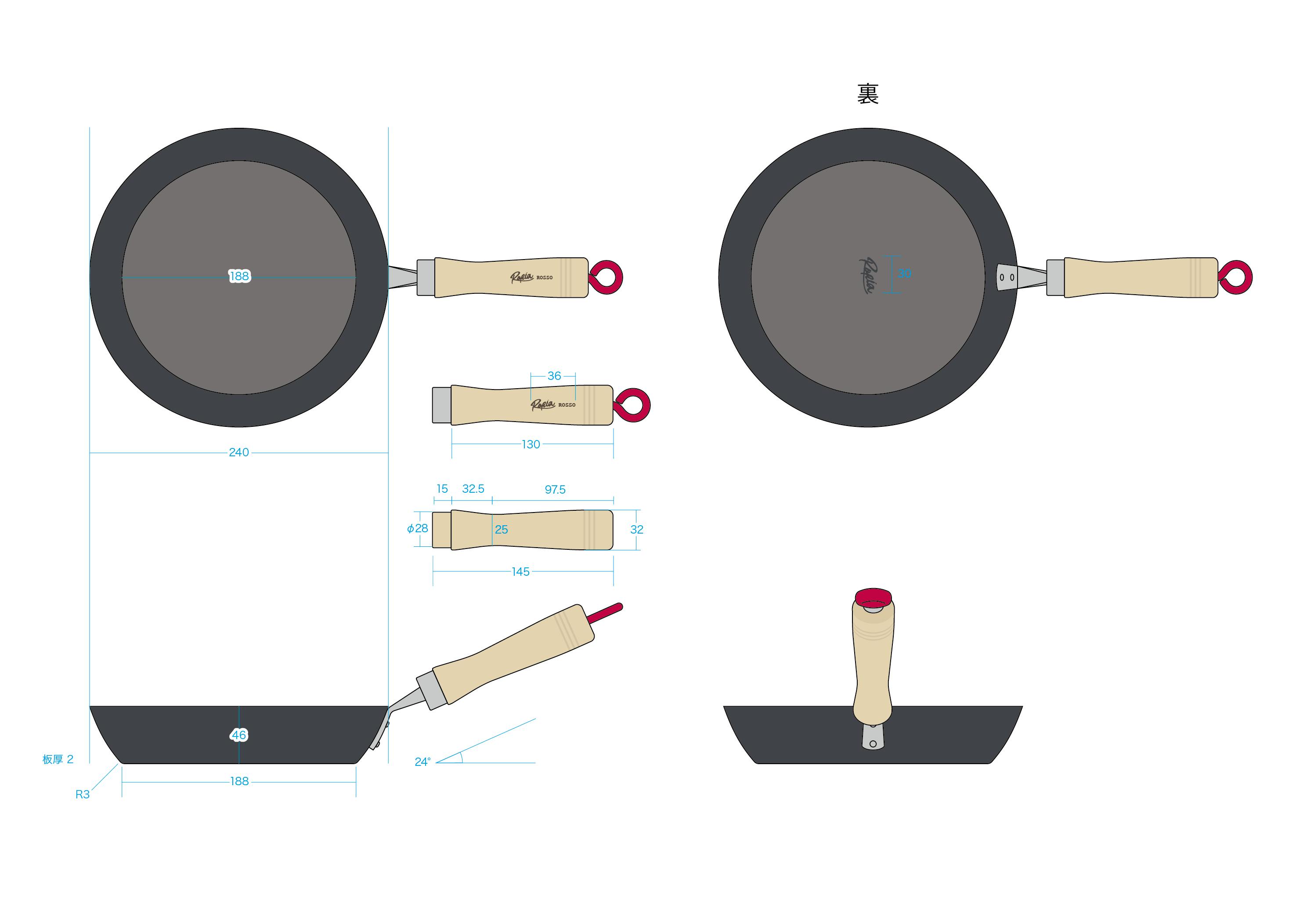 そこで窒化鉄フライパン「Rosso」はできる限り内径を確保しつつ、フライパンを振った時にもしっかり炒めることができるヘリの角度「R3」に辿り着きました。