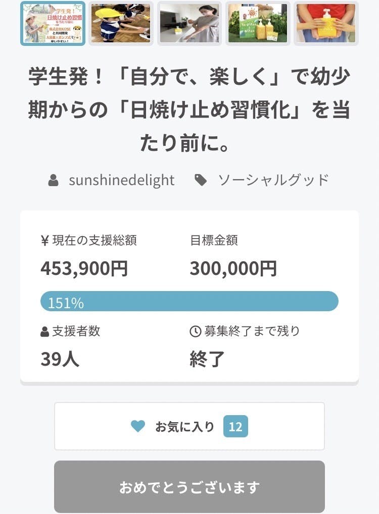【御礼】「学生発!『自分で、楽しく』で幼少期からの『日焼け止め習慣化』を当たり前に。」、目標金額を達成し、終了いたしました!