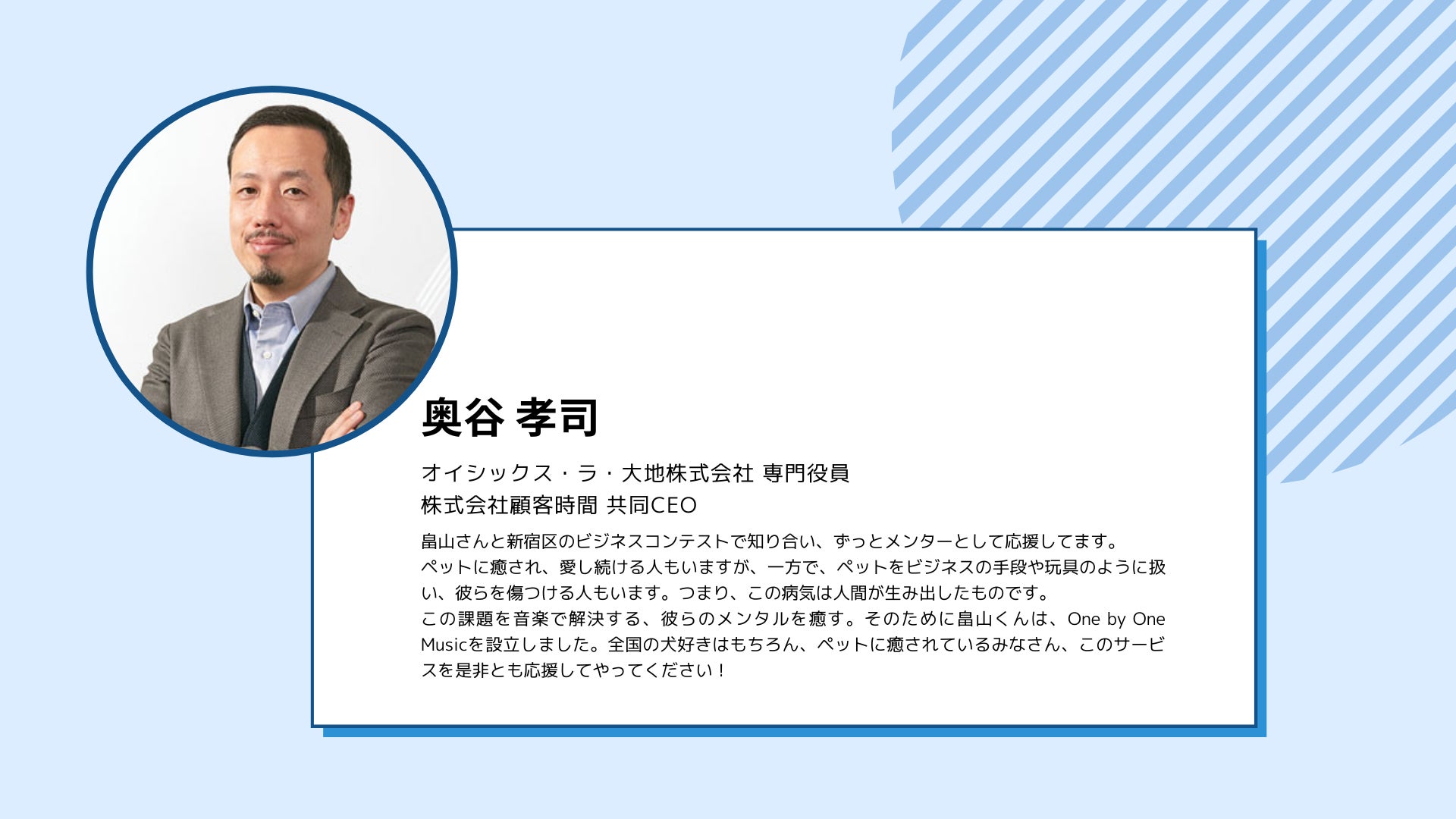 2022/12/15 07:00オイシックス・ラ・大地株式会社専門役員で、One by One Musicの熱いメンターでもある奥谷孝司さまより、応援メッセージをいただきました!畠山さんと新宿区のビジネスコンテストで知り合い、ずっとメンターとして応援してます。 ペットに癒され、愛し続ける人もいますが、一方で、ペットをビジネスの手段や玩具のように扱い、彼らを傷つける人もいます。つまり、この病気は人間が生み出したものです。 この課題を音楽で解決する、彼らのメンタルを癒す。そのために畠山くんは、One by One Musicを設立しました。全国の犬好きはもちろん、ペットに癒されているみなさん、このサービスを是非とも応援してやってください!熱烈な応援メッセージをありがとうございます。引き続き、大切なペットのための活動を進めていきます! もっと見る