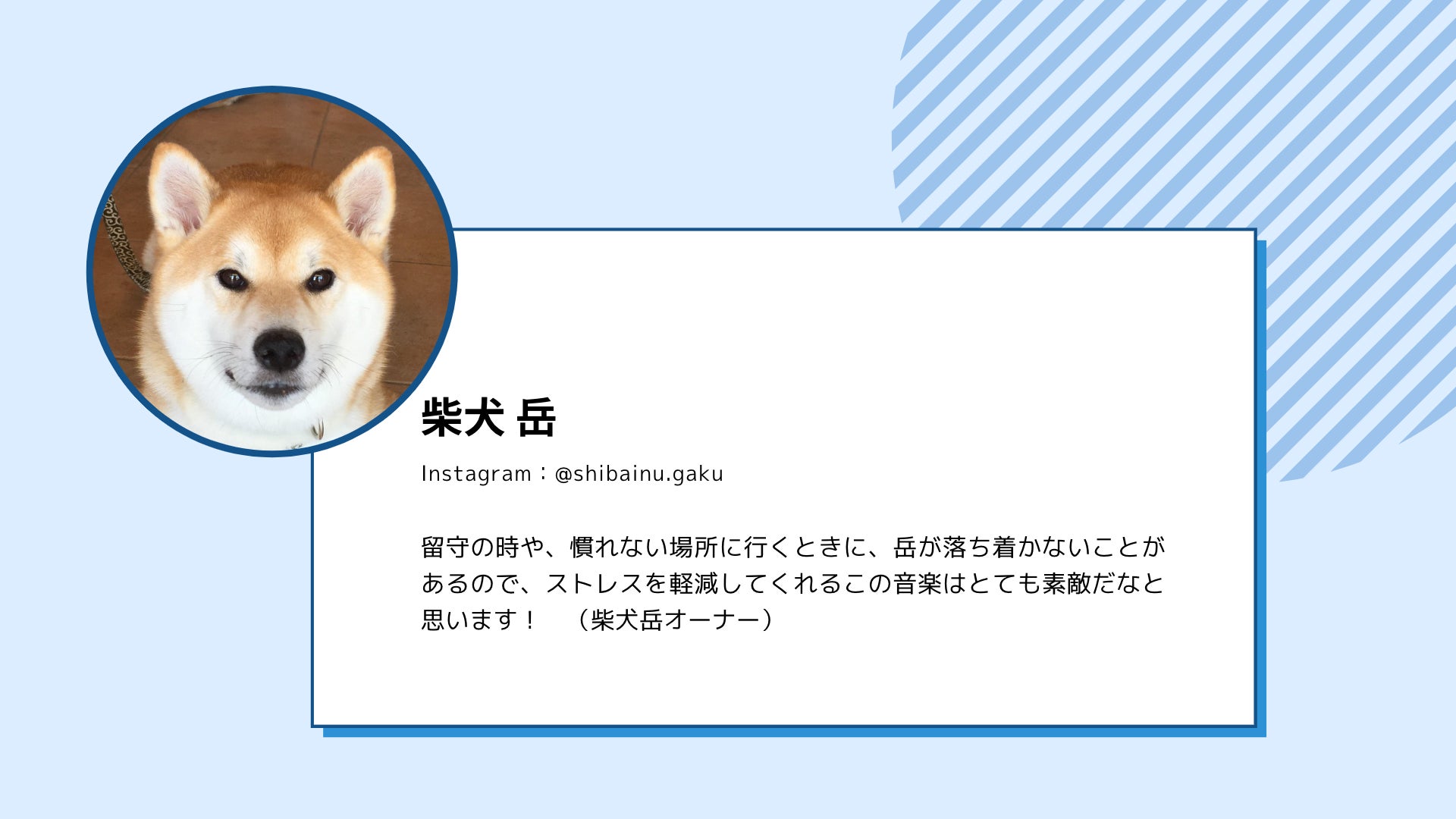 2022/12/17 07:00Instagramで大人気の柴犬 岳くんから、応援メッセージをいただきました!留守の時や、慣れない場所に行くときに、岳が落ち着かないことがあるので、ストレスを軽減してくれるこの音楽はとても素敵だなと思います!(柴犬岳オーナー)素敵な応援メッセージ ありがとうございます。引き続き、大切なペットのための活動を進めていきます! もっと見る