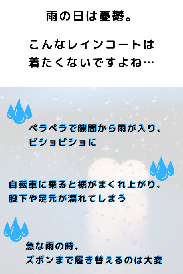 一般的なレインコートはファスナーやボタンで「前開き」でとめるため、雨の中で自転車を漕いでいると前部分がずり上がってきて膝上がむき出しになってしまいます…