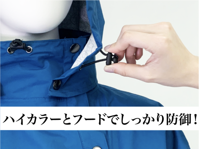 MORRの高めに設計された襟部分と、襟部分に搭載された折り畳み式のフードが首への雨水の流入を防ぎます!また紐で調節可能なので通気性は自分で調節できます。