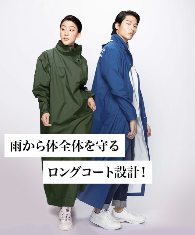 体全体が雨に濡れないために、足首まで隠れる超ロング丈を採用しました。