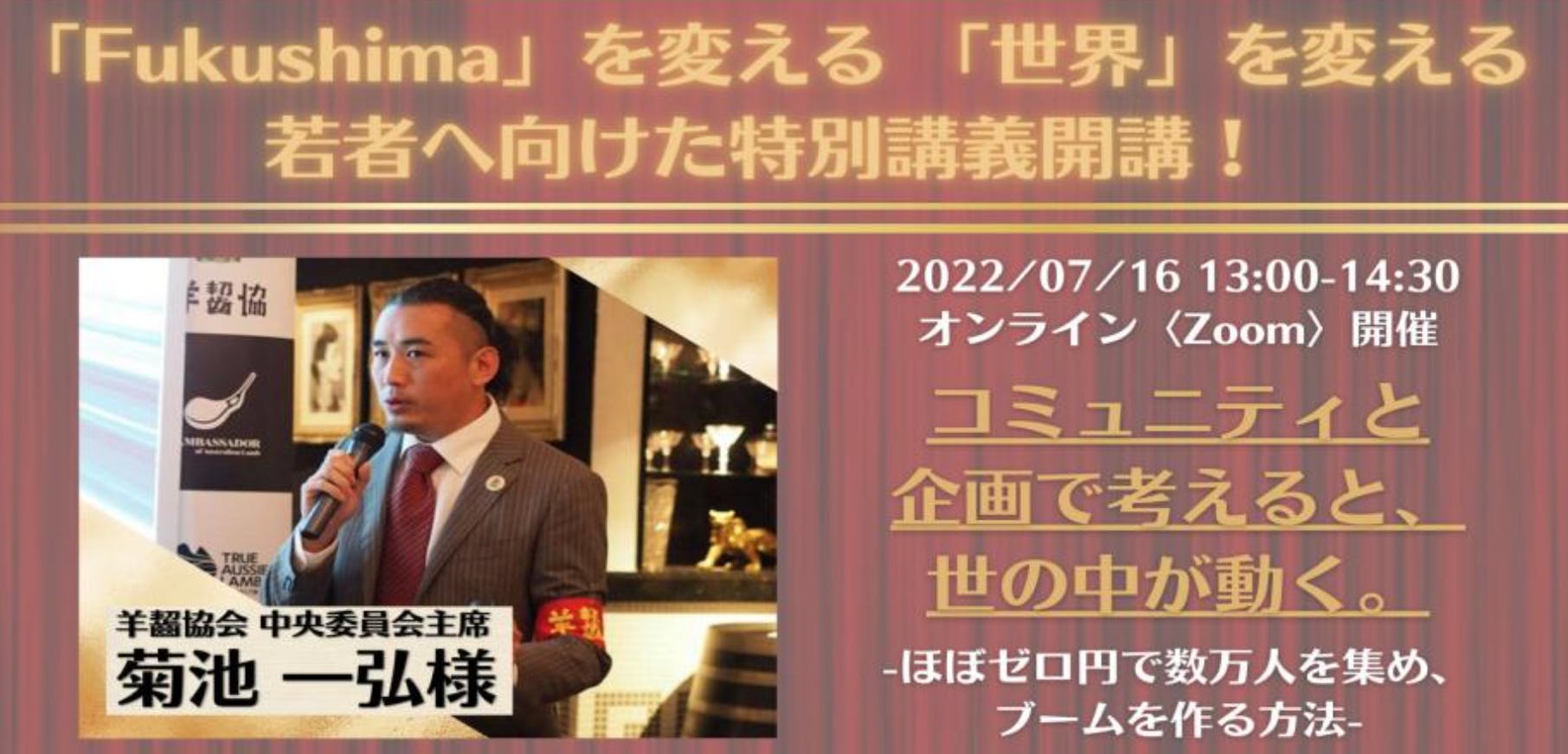 2022/07/12 08:00地域のコミュニティづくりに興味がある方は、必見!!『「Fukushima」を変える 「世界」を変える 若者へ向けた特別講義開講!』数々の経営者や著名人にご登壇いただき、7月から12月までの期間で、合計30講演を開催いたします!主催は、福島県内最大級の学生コミュニティ「Spread From Fukushima(通称:SFF)」です。本イベントは、SFF主催の人財育成プログラム「Fukushimafrogs」の研修費用に充てられる寄付講座として、講師の方には若者に向けた特別講義を行なっていただきます。本ページは、第4回目のオンライン講義チケットの販売を行います。ーこんな方に見て欲しい!!「地方で働きたい!!」「私の個性や強みって何だろう?」「地域とどう関わるのか考えたい」「何か大きなことを成し遂げてみたいけど、何から始めたらよいかわからない...」........上記に1つでも当てはまる方は、ぜひこの講演をご覧頂くことをおすすめします。講演を通して、答え・ヒントが見つかるはずです。【講師】丸毛幸太郎氏【講義タイトル】人と人を繋ぐコミュニティデザイナー。「地域とわたし」の楽しい関係づくり〜その地域だからこそできること〜【内容】(講義:10:00~11:00 質疑応答:11:00~11:30)地方でこそ、生かせるもの。その地域でしか、できないこと。これを地域の住民の方々と協同して生かすことができるのが、コミュニティデザイナーの職業です。地域と人に密着した、新たな視点や発見を見つけられるかもしれません。【講師の方からのメッセージ】地域、コミュニティ、関係づくり。どれもがコロナで難しくなったけど、その分だけ新しい余白もたくさん生まれたこの2年。これまでのこと、これからのこと、を一緒に対話しながら考えましょう。【プロフィール】2012年からファシリテーションをベースに、研修やワークショップから、新規プロジェクト組成や伴走支援、組織の理念策定まで、幅広い「場づくり」や「プロジェクト」に関わる。 コロナ禍においては「100%オンライン」での活動に移行。実践で培った知見やノウハウを、分野を問わず広く発信・普及する活動に取り組む。「ファシリテーションの基礎力からオンラインでの実践力まで一気に学ぶ【オンラインファシリテーション実践講座】」「ワークショップデザイナーの社会人を育成する100日間伴走プログラム【ワークショップ大学校】」などを企画・運営する。丸毛幸太郎氏ウェブサイトhttps://marumo1122.jp/1お申し込みは、下記のpeatixのイベントページから!!https://peatix.com/event/3286757/view もっと見る