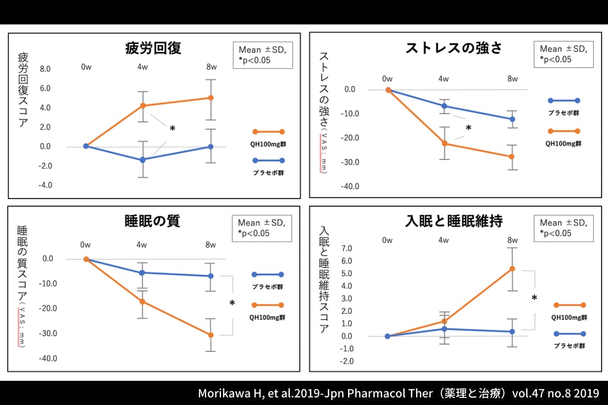 還元型コエンザイムQ10が健康維持に有用だということは、いろいろな研究からも知られるようになっています。オレンジのグラフが還元型コエンザイムQ10を使用した方の体感値です。