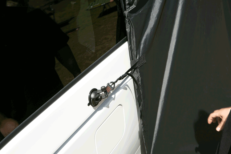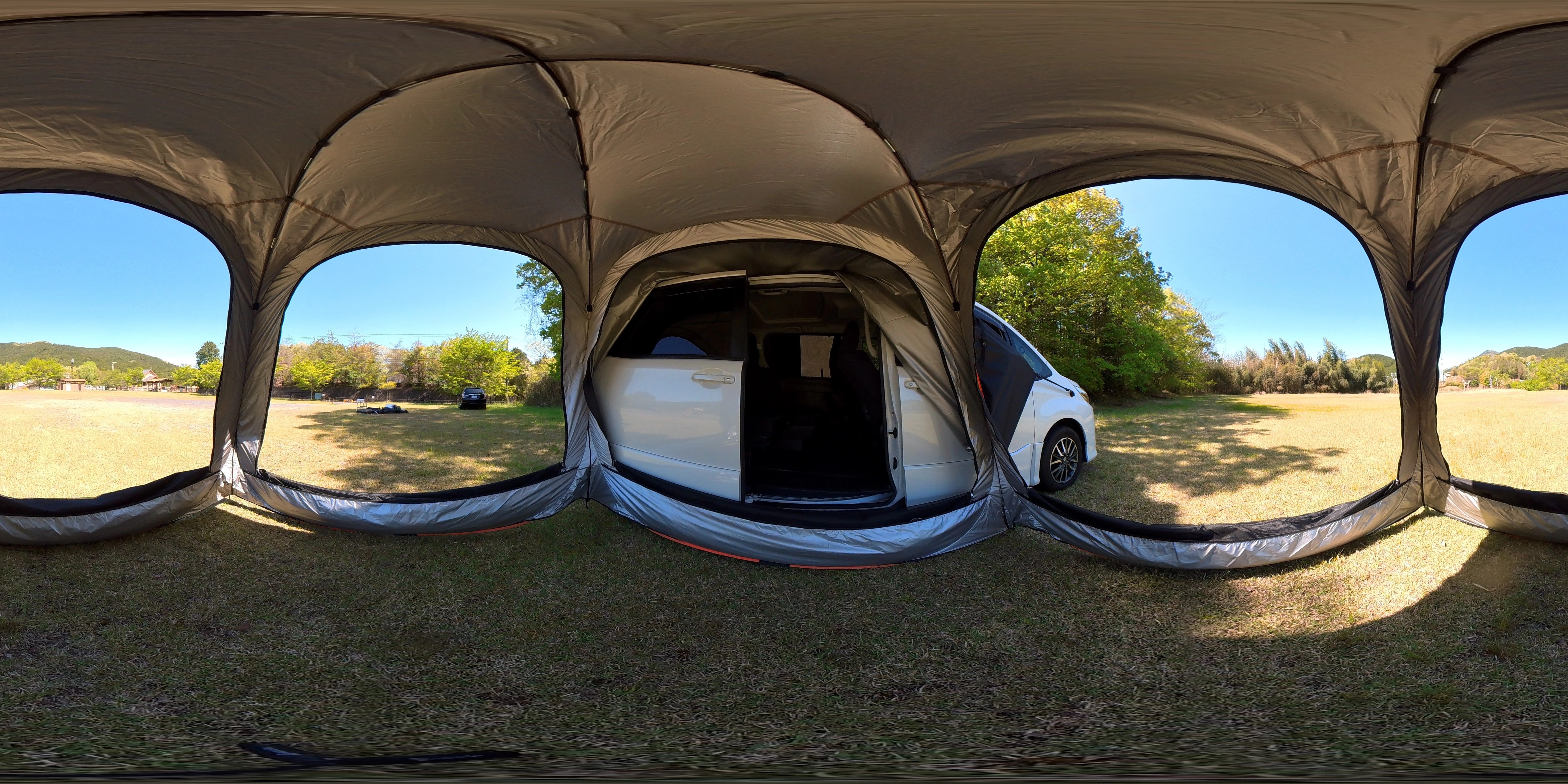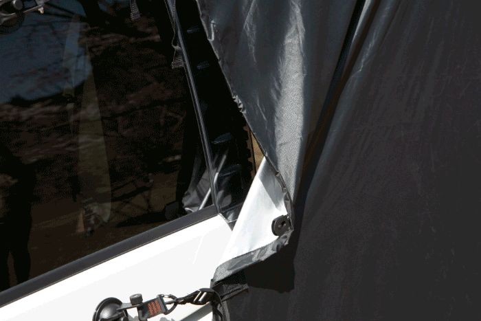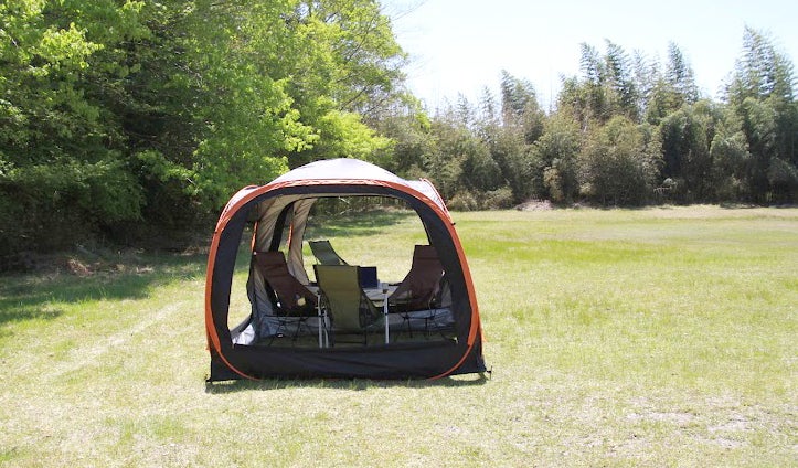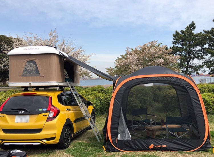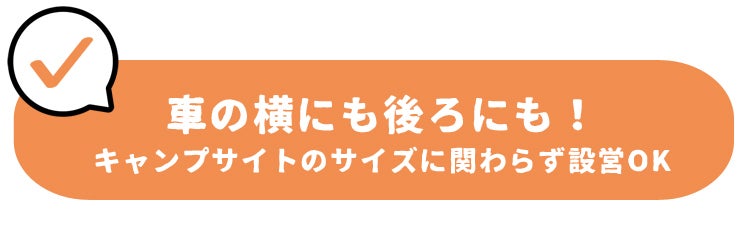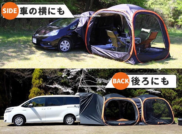 車の後ろにテントを立てるスペースがない場所でも、横につけられるからキャンプサイトを選びません。