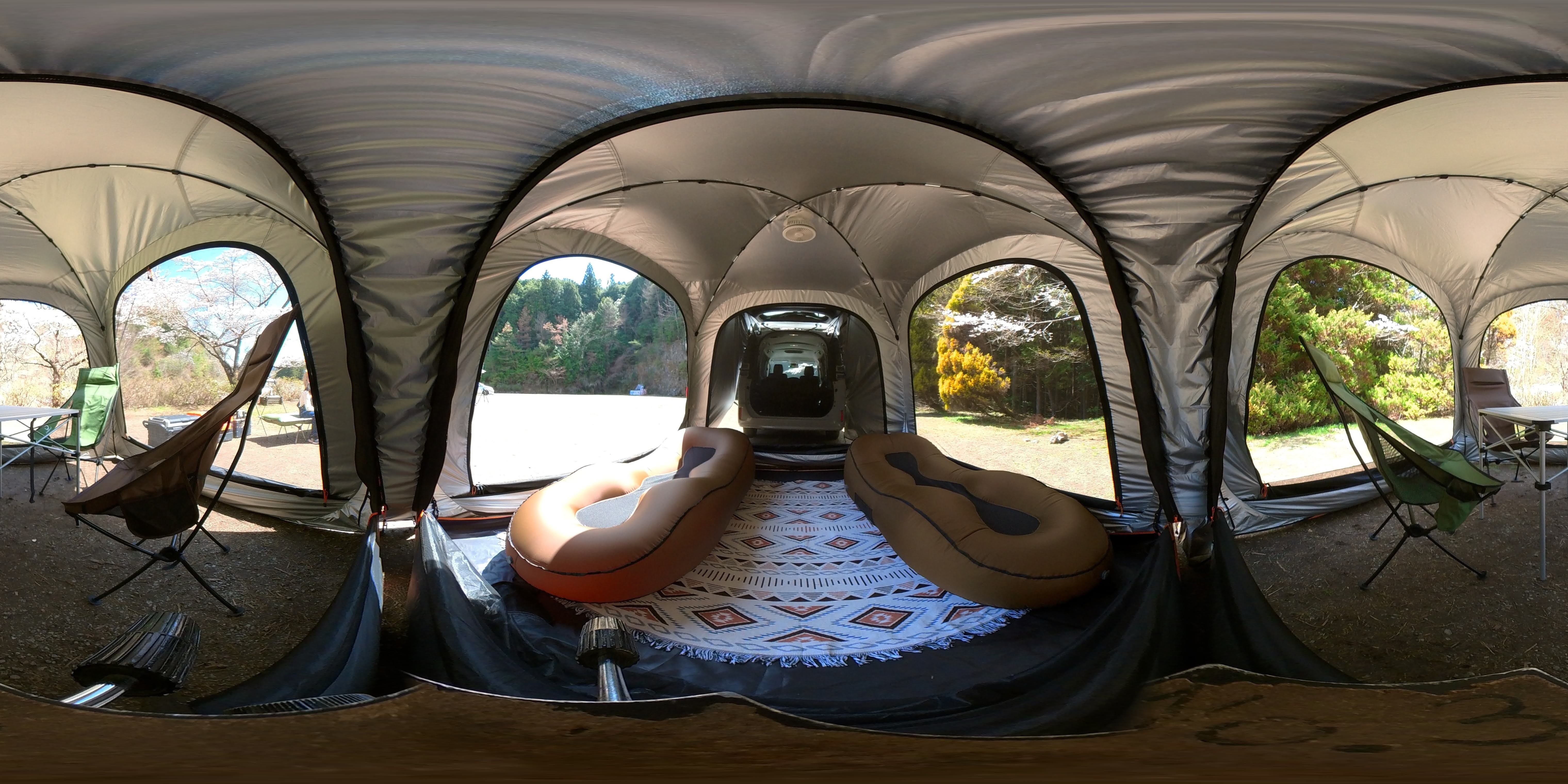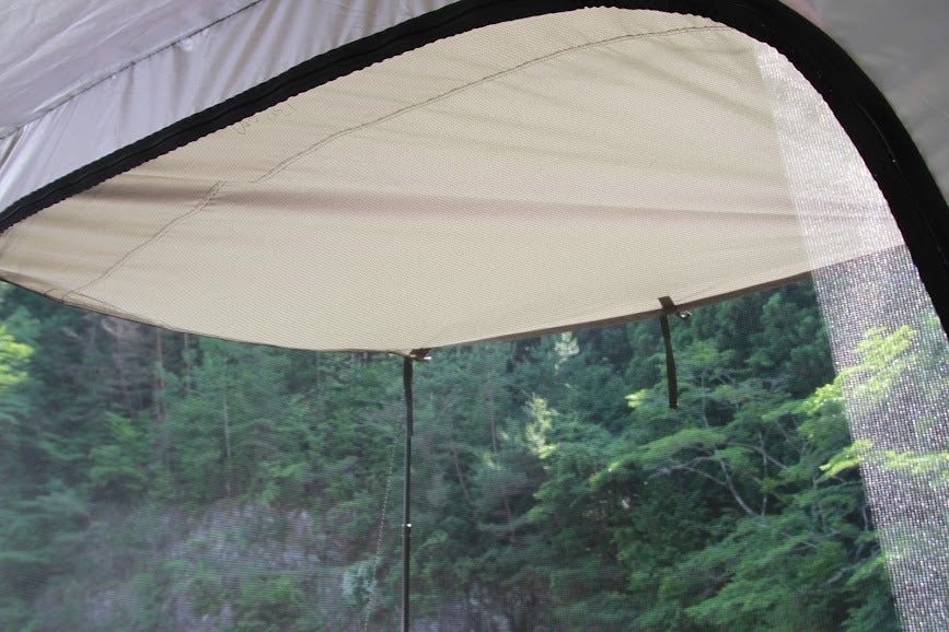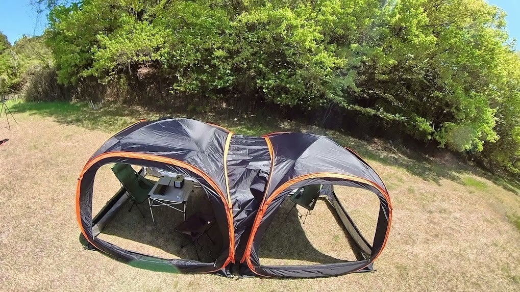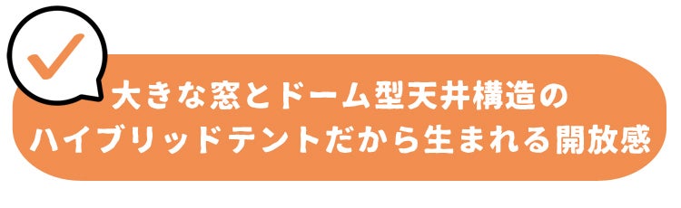 ポップアップテント+ドーム型テントの良いところ取りのハイブリット仕様で、室内最高210cmという大空間のため圧迫感を全く感じません。(LINK POP内部から360度パノラマ写真)