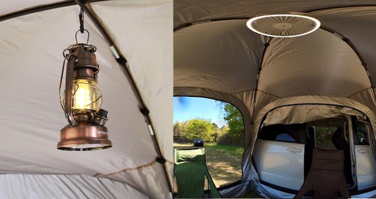 テント上部にはランタンや扇風機を取り付けることができます!