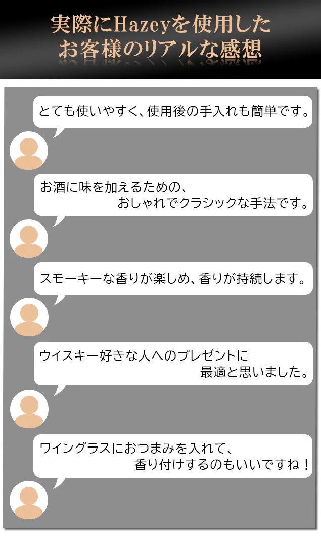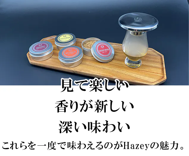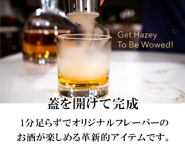 手軽に特別なフレーバーのウイスキーが楽しめるスモークカクテルキット「HAZEY」がついに日本上陸! リターン品の配送が完了するまで、Ys-tradingはHazeyの日本における独占販売権を有する正規代理店です。詳細に関しては、ページ下部のリスク&チャレンジをご確認ください。
