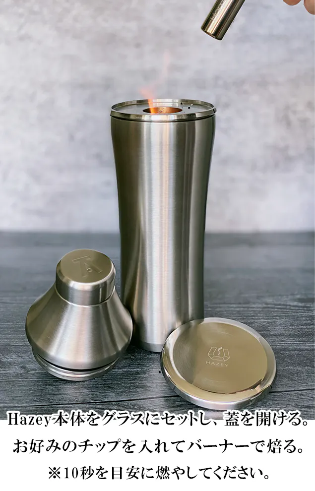 A、10秒間燃焼させ、Hazeyをテストしましたが、Hazey本体が熱くなることなく、グラスを満たすのに十分な煙が発生しました。また、火を止めた後20〜30秒間蓋をすることでより香り高いスモークをお楽しみいただけます。火傷を防ぐため、燃焼させる前に木材チップが本体内に充填されていることを確認してください。