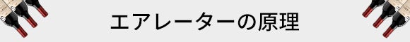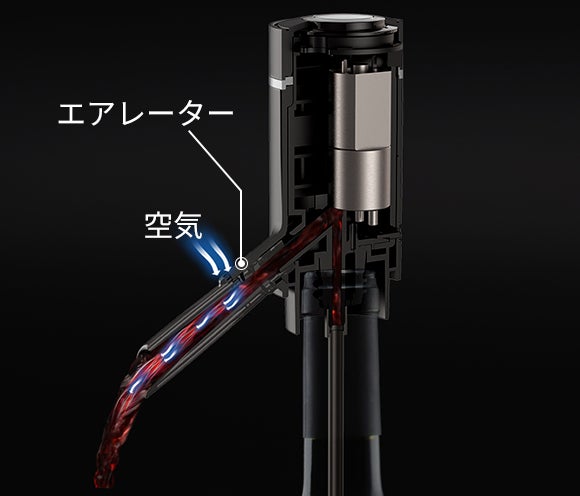 ワインディスペンサーの注ぎ口にはエアレーターのボタンがあります。エアレーターのボタンをONにし、ワインをグラスに注ぐときにエアレーターを通すことで、ベルヌーイの定理により、エアレーターの側面にある通気孔から酸素が取り込まれ、ワインにエアレーションと呼ばれる泡立ちを発生させます。ワインで立った泡に含まれている酸素は液体と混ざり十分に反応され、エアレーションの効果を果たします。