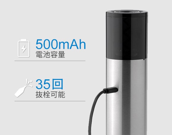 500mAhの電池が内蔵、フル充電で最大約35回コルクを抜くことができます。